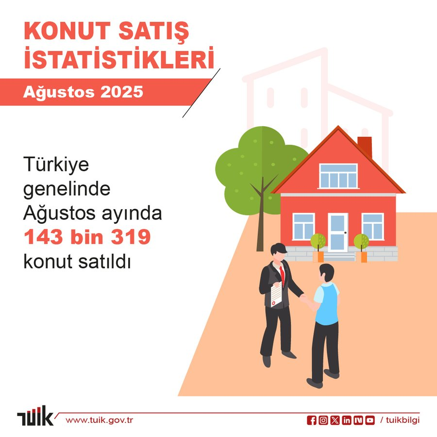 Türkiye genelinde konut satışları Ağustos 2025’te geçen yılın aynı ayına göre %6,8 artarak 143 bin 319 oldu. En fazla satış 21 bin 814 ile İstanbul’da gerçekleşirken, ipotekli satışlarda %45,2’lik dikkat çekici bir artış yaşandı. Yabancılara konut satışı ise %19,8 düşüşle 1.810 seviyesine geriledi.