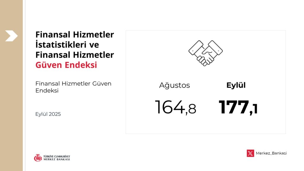 Türkiye Cumhuriyet Merkez Bankası (TCMB), Eylül 2025 dönemine ilişkin Finansal Hizmetler İstatistikleri ve Finansal Hizmetler Güven Endeksi (FHGE) sonuçlarını yayımladı. Buna göre, Finansal Hizmetler Güven Endeksi bir önceki aya göre 12,3 puan yükselerek 177,1 seviyesinde gerçekleşti. Ağustos ayında endeks değeri 164,8 olarak kaydedilmişti.