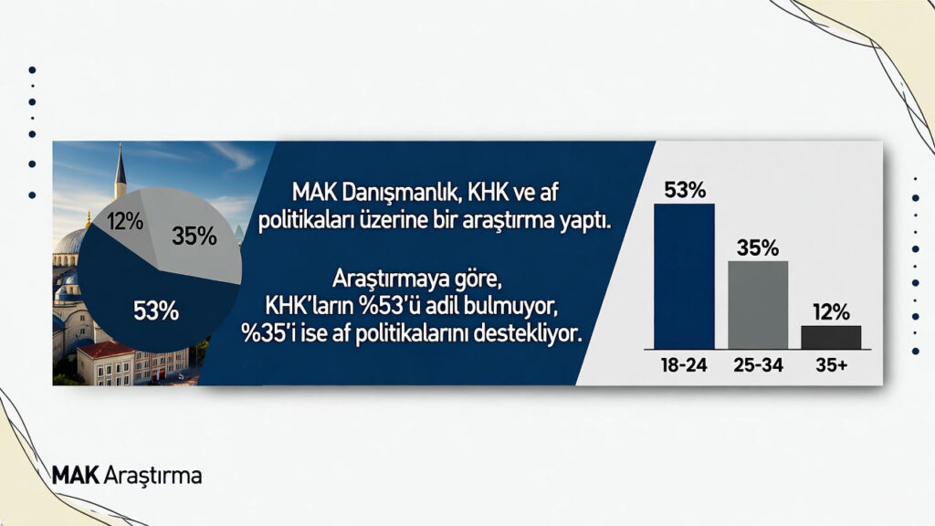 MAK Danışmanlık’ın 3200 kişiyle yaptığı araştırmaya göre, Türkiye’de KHK ihraçları %53 oranında adil bulunmuyor. Af politikalarına %35 destek var. Toplumsal bakış, mağduriyet ve barış beklentilerini ortaya koyuyor. Detaylar için okuyun!