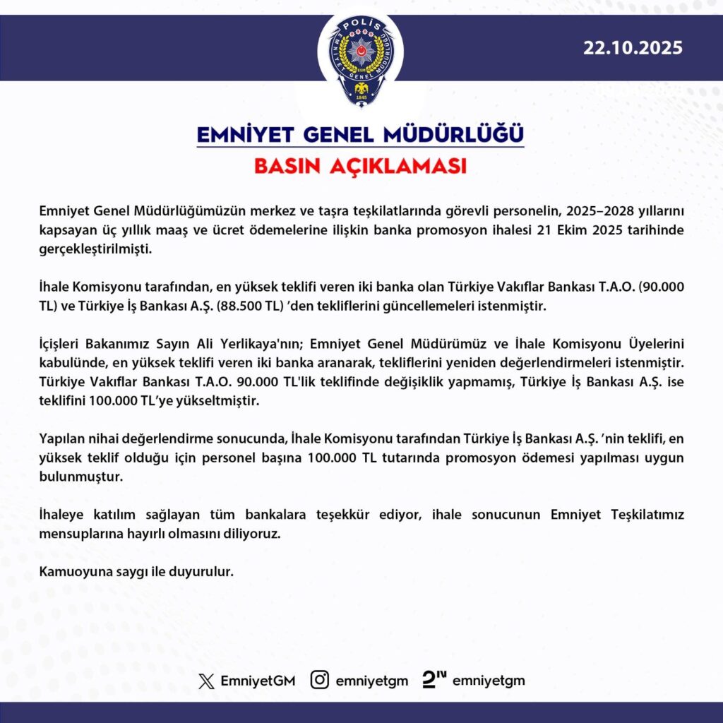 Emniyet Genel Müdürlüğü (EGM), 2025-2028 yıllarını kapsayan üç yıllık maaş promosyon ihalesinin sonucunu açıkladı. 21 Ekim 2025 tarihinde yapılan ihalede Türkiye İş Bankası A.Ş., 100.000 TL teklif vererek süreci kazandı.