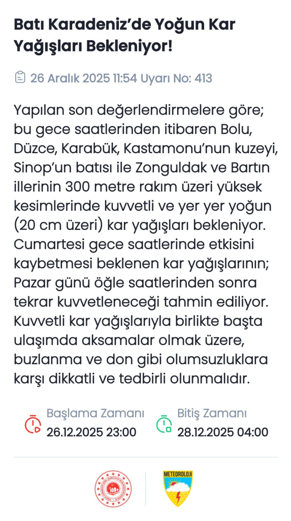 Meteoroloji Genel Müdürlüğü, 26 Aralık 2025 tarihli uyarısında Batı Karadeniz’de 300 metre üzeri kesimlerde 20 cm’yi aşan yoğun kar yağışı beklendiğini açıkladı. Ulaşımda aksamalar ve buzlanmaya karşı dikkat çağrısı yapıldı.