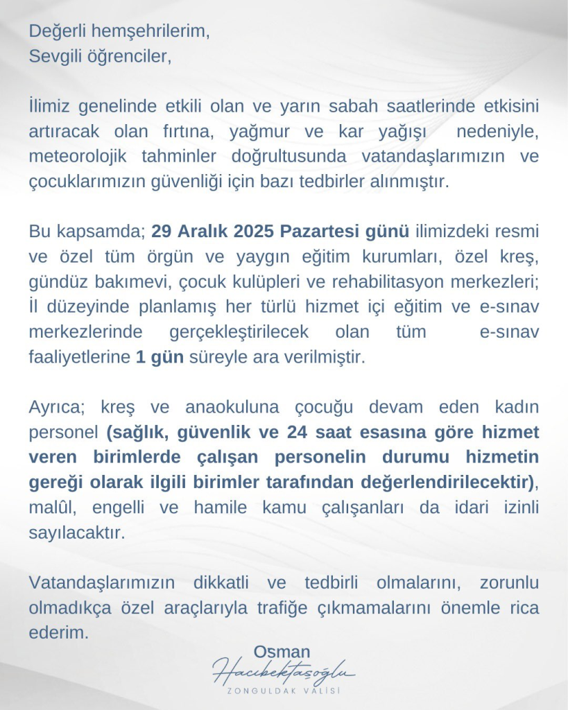 Zonguldak Valiliği, olumsuz hava koşulları nedeniyle 29 Aralık 2025 Pazartesi günü il genelinde tüm eğitim kurumlarında eğitime 1 gün ara verildiğini açıkladı.