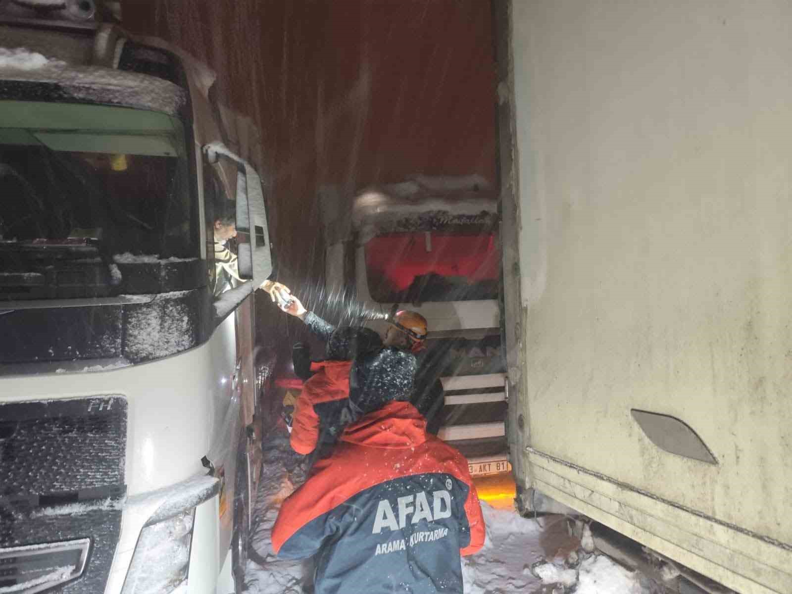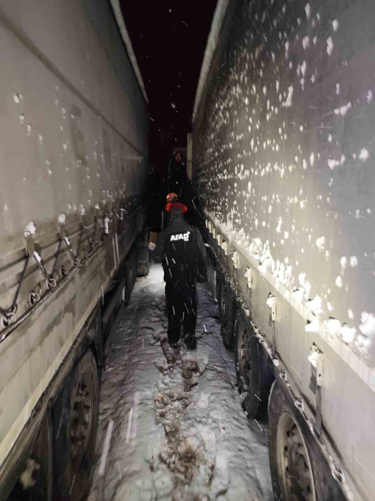 Van genelinde etkili olan yoğun kar yağışı ve olumsuz hava koşulları nedeniyle yollarda mahsur kalan vatandaşlara yönelik yardım çalışmaları aralıksız sürdürülüyor. Van Afet ve Acil Durum (AFAD) İl Müdürlüğü koordinesinde yürütülen çalışmalarda, kar yağışı ve tipi nedeniyle ulaşımın aksadığı güzergâhlarda mahsur kalan araçlardaki vatandaşlara gıda ve sıcak içecekten oluşan kumanya desteği sağlandı.