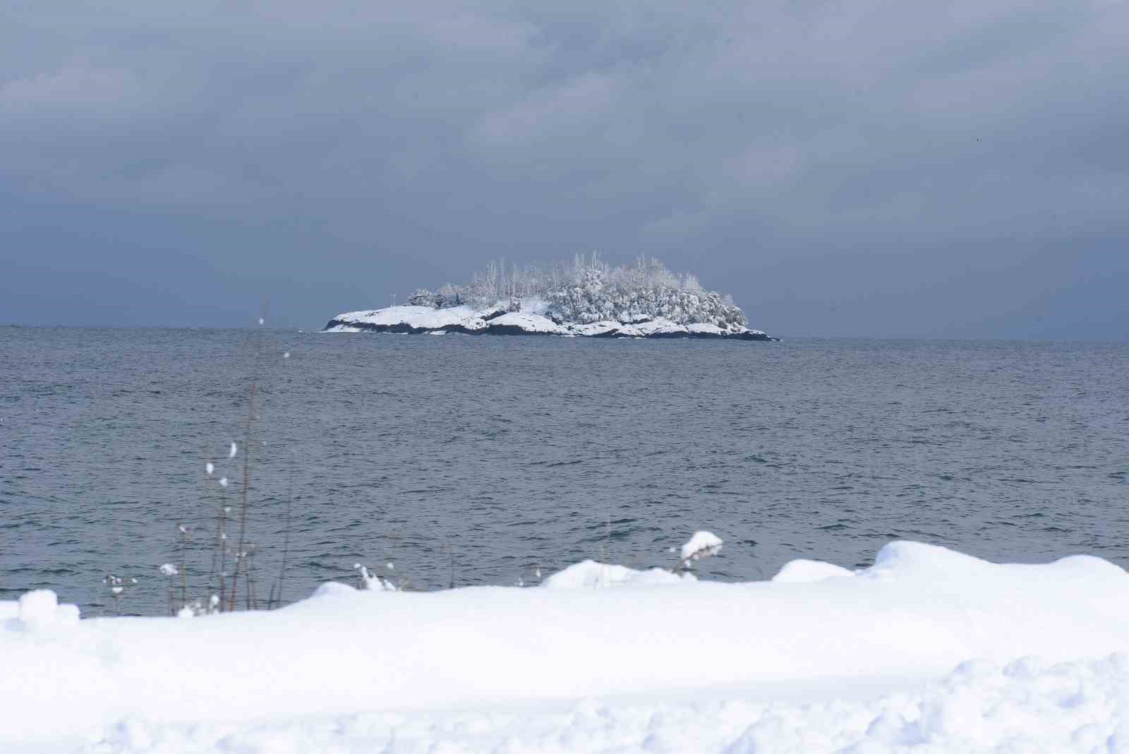 Doğu Karadeniz’in tek yaşanabilir adası olma özelliğini taşıyan Giresun Adası ise fırtınalı denizin ortasında karla kaplanarak kendini gösterdi. Beyaz örtüyle kaplanan ada, çevresini saran dalgalarla birlikte adeta gelinlik giymiş görüntüsüyle izleyenleri hayran bıraktı.