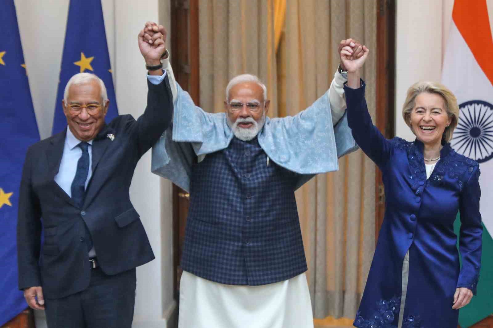 AB Komisyonu Başkanı Ursula von der Leyen ise konuşmasına Avrupa’nın Hindistan’ın yükselişinden memnuniyet duyduğu ve bunun dünyayı daha istikrarlı ve müreffeh hale getirdiği mesajlarıyla başladı. Von der Leyen, “Başardık. Tüm anlaşmaların anasını hayata geçirdik. İki milyar insanı kapsayan bir pazar oluşturuyoruz. Bu, dünyanın ikinci ve dördüncü en büyük ekonomilerinin, yani iki devin hikayesidir. Gerçek bir kazan-kazan anlayışıyla ortaklığı seçen iki dev” dedi.