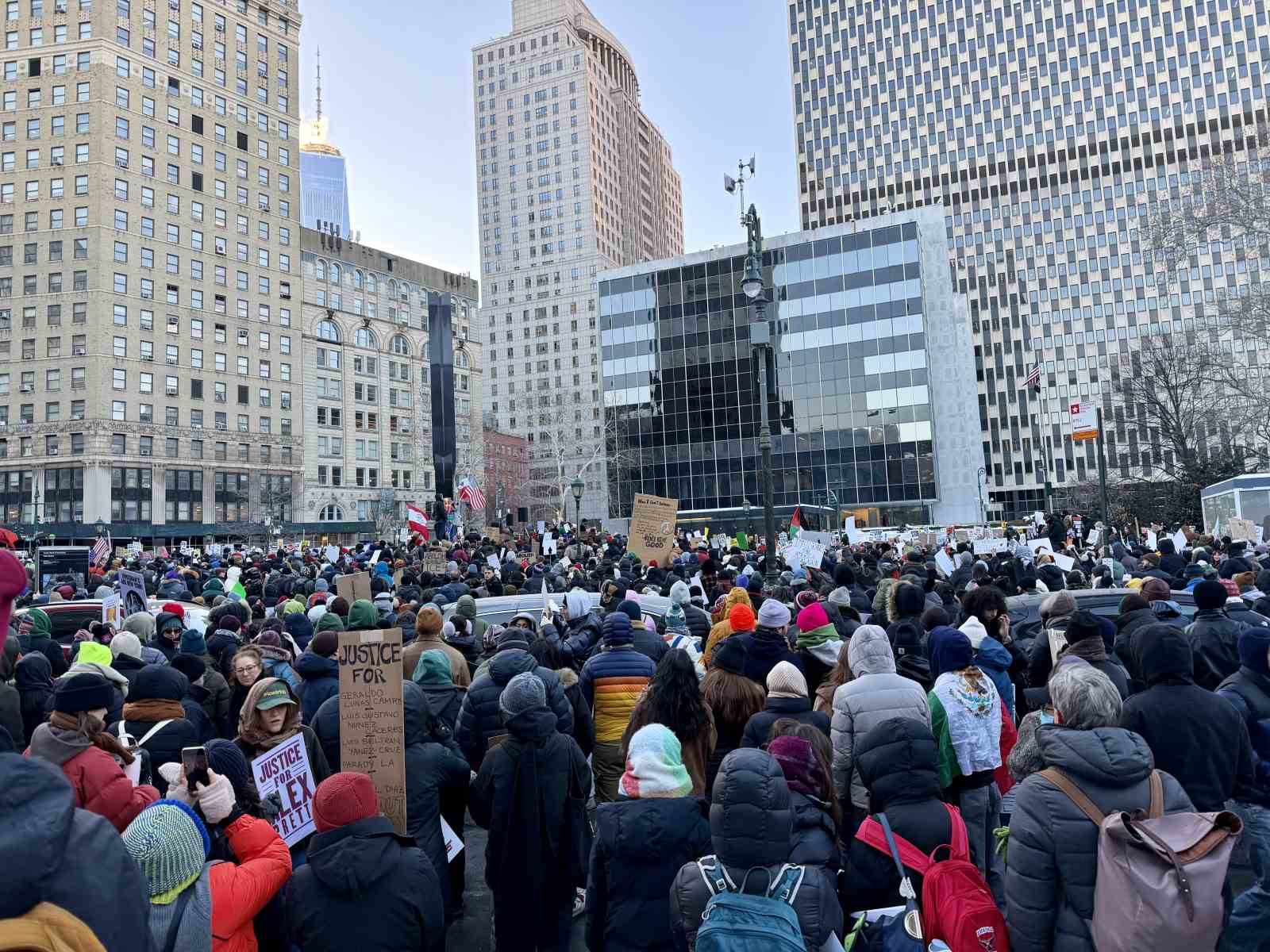 New York şehrinin Manhattan bölgesinde binlerce kişi Foley Meydanı’nda toplandı. Göstericiler, Minnesota eyaletindeki Minneapolis kentinde ABD vatandaşları Renee Good ve Alex Pretti’nin hayatını kaybettiği olayların ardından göçmenlere yönelik baskılara ve ICE faaliyetlerine tepki gösterdi. Yaklaşık 7 bin kişinin katıldığı Manhattan’daki gösteri, ülke çapında planlanan “ulusal kapanma” eylemleriyle eş zamanlı olarak gerçekleştirildi. Organizatörler, bu çağrıyla okulların ve iş yerlerinin boş kalmasını, kamuoyunun dikkatinin ise federal göçmenlik baskınlarına çevrilmesini hedeflediklerini açıkladı.
