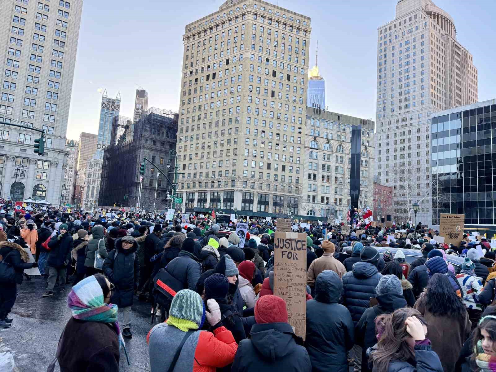 ABD genelinde her eyalette binlerce kişi, ABD Başkanı Donald Trump yönetiminin göçmenlik politikaları ve ICE faaliyetlerine tepki göstermek amacıyla “iş yok, okul yok, alışveriş yok” çağrısıyla ülke çapında protestolar düzenlerken, New York’ta soğuk havalara rağmen yaklaşık 7 bin kişi Foley Meydanı’ndan toplandı.
