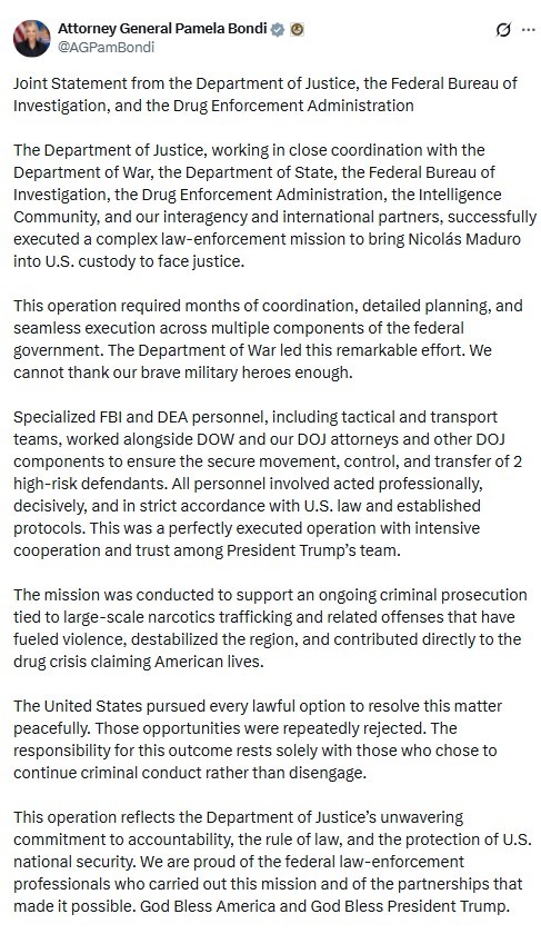 ABD Adalet Bakanlığı (DOJ), Federal Soruşturma Bürosu (FBI) ve Uyuşturucuyla Mücadele Dairesi (DEA), Venezuela Devlet Başkanı Nicolas Maduro ve eşine yönelik operasyon ile ilgili ortak bir açıklama yaptı. ABD Adalet Bakanı Pam Bondi’nin sosyal medya platformu X üzerinden paylaştığı açıklamada, Maduro’yu ABD’de adalete teslim etmeyi amaçlayan karmaşık bir kolluk görevinin başarıyla tamamlandığı vurgulanarak, “Bu operasyon, federal hükümetin birçok birimi arasında aylarca süren bir koordinasyon, ayrıntılı bir planlama ve kusursuz bir uygulama gerektirdi. ABD Savunma Bakanlığı bu olağanüstü çabaya öncülük etti. Cesur ve kahraman askeri personelimize ne kadar teşekkür etsek azdır” ifadeleri kullanıldı.