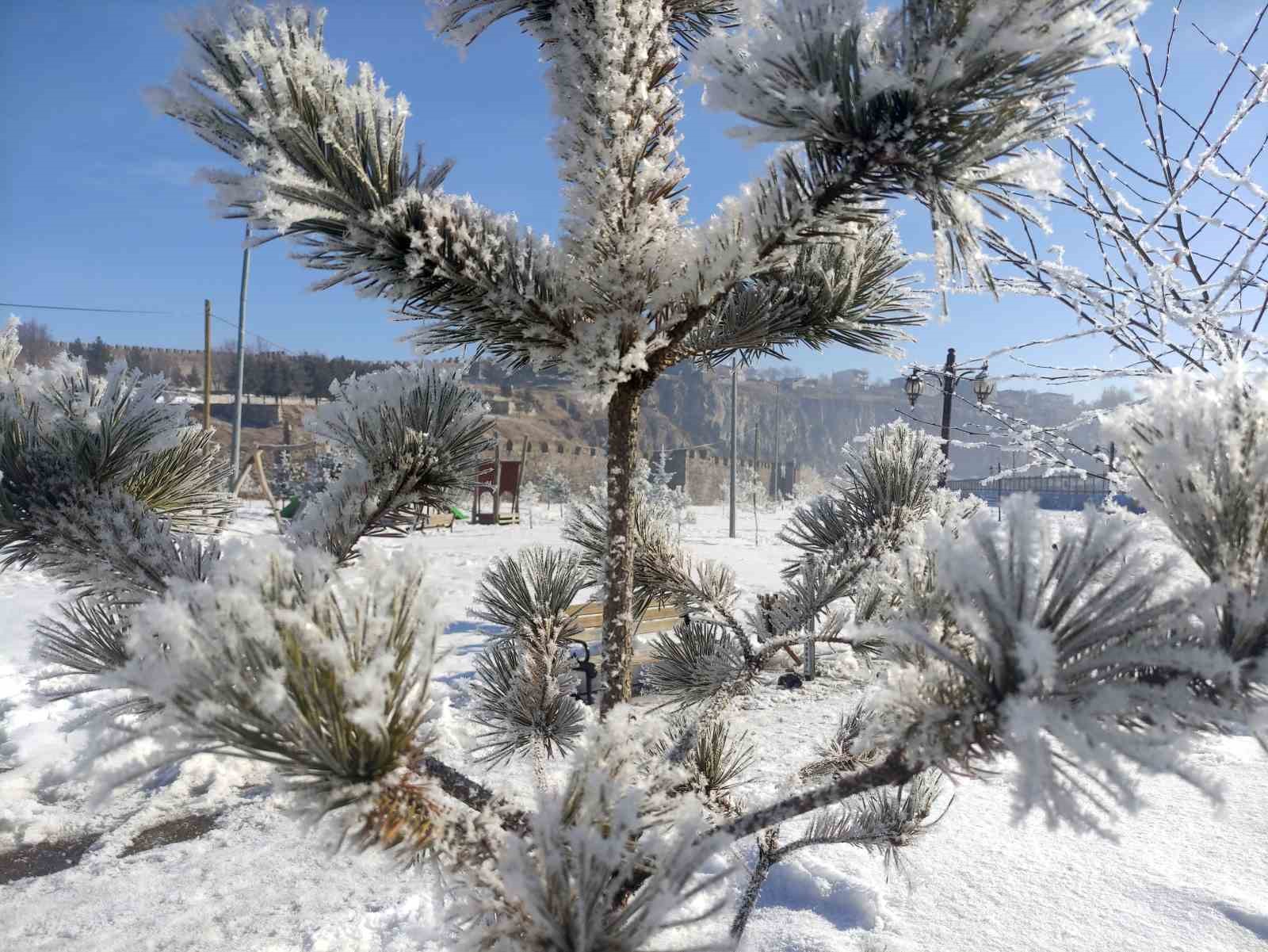 Hava sıcaklığının sıfırın altında 23 dereceye kadar düştüğü Göle ilçesinde, geceleri yaşanan soğuklar nedeniyle oluşan kırağı ağaçları süslemeye devam ediyor.