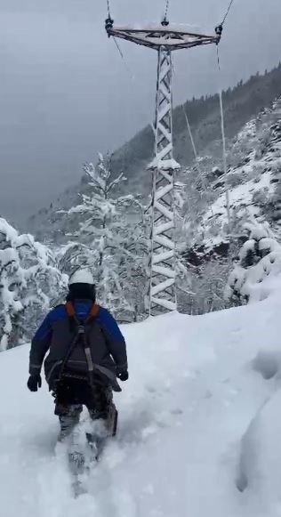 Yoğun kar yağışı ve buzlanma nedeniyle bazı bölgelerde yollar ulaşıma kapanırken, enerji nakil hatlarında oluşan arızalara müdahale etmek için görev yapan ekipler, zaman zaman diz boyunu aşan kar üzerinde yürümekte güçlük çekiyor. Araçların ilerleyemediği noktalarda saatlerce karda yürüyerek arıza bölgelerine ulaşan ekipler, zorlu hava ve arazi şartlarına rağmen çalışmalarını sürdürüyor.