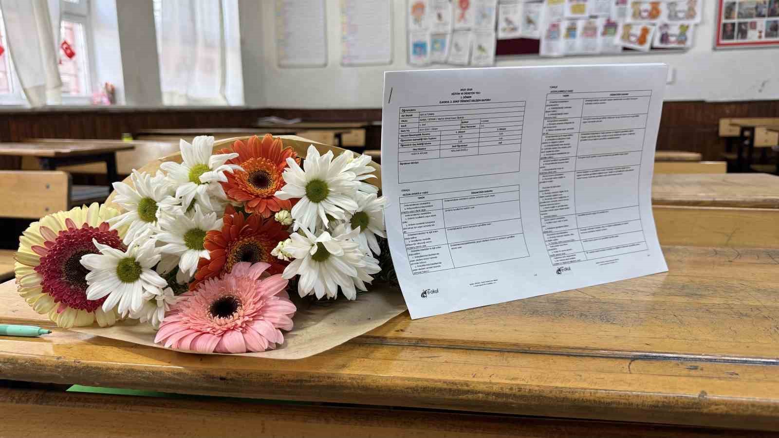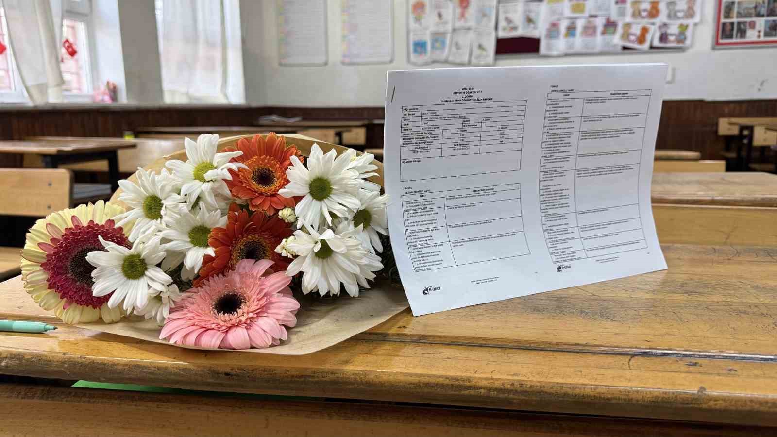 Adana’da babaları tarafından öldürülen Ada ve Mert’in karneleri, çiçeklerle birlikte sınıflarındaki masalarına bırakıldı.
