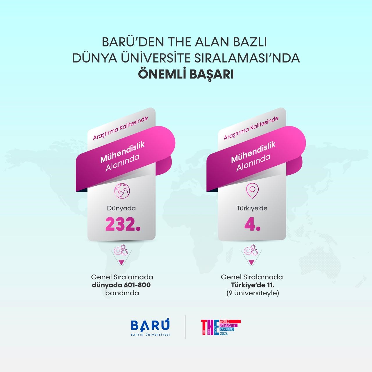 Bartın Üniversitesi (BARÜ) Times Higher Education (THE) 2026 Alan Bazlı Sıralaması’nda “Eğitim Çalışmaları” Araştırma Kalitesi göstergesinde dünyada 117’nci, Türkiye’de 1’inci; “Mühendislik” alanında ise dünyada 232’nci, Türkiye’de 4’üncü sırada yer aldı.