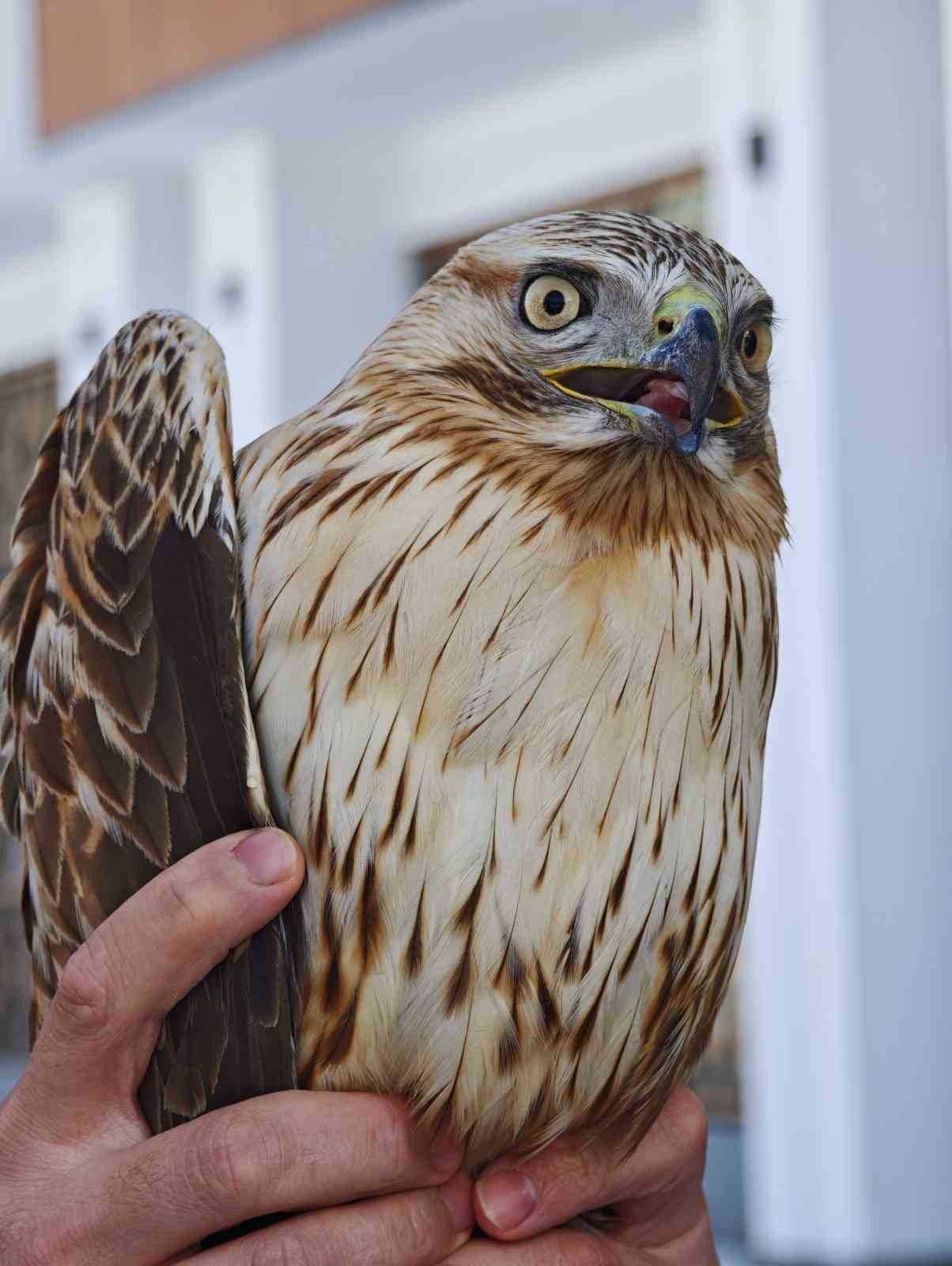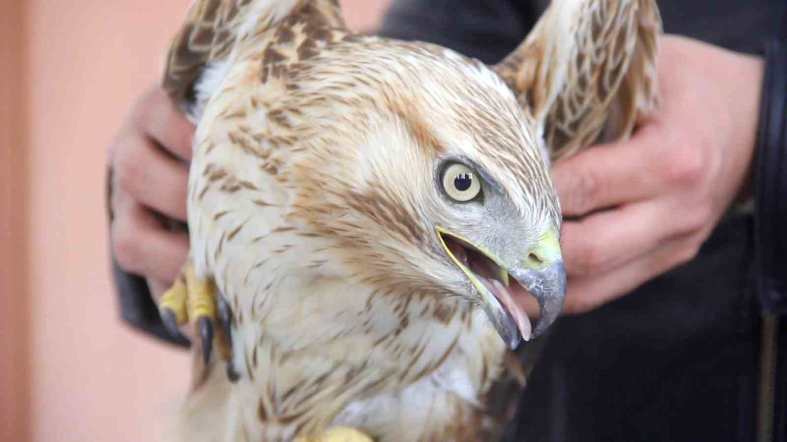 Sivas’ın Zara ilçesinde bitkin halde bulunan kızıl şahin, Doğa Koruma ve Milli Parklar ekiplerine teslim edildi.