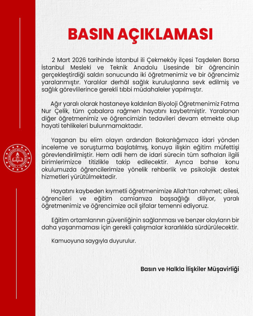 Ayrıca okulda öğrencilere yönelik rehberlik ve psikolojik destek hizmetlerinin başlatıldığı açıklandı. Eğitim ortamlarının güvenliğinin sağlanması ve benzer olayların tekrar yaşanmaması için gerekli çalışmaların kararlılıkla sürdürüleceği ifade edildi.
