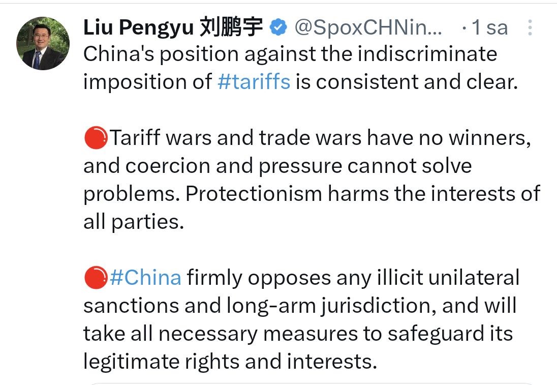 ABD Başkanı Donald Trump’ın İran ile iş yapan ülkelerin ABD ile gerçekleştirdiği her türlü ticari faaliyette yüzde 25 gümrük vergisi ödeyeceği yönündeki açıklamasına Çin’den tepki geldi. Çin’in ABD Büyükelçiliği Sözcüsü Liu Pengyu sosyal medya platformu X üzerinden yaptığı açıklamada, ülkesinin gümrük vergileri konusundaki tutumunun ayrım gözetmeksizin tutarlı ve net olduğunu vurgulayarak, “Gümrük vergisi savaşlarının ve ticaret savaşlarının kazananı yoktur, zorlama ve baskı sorunları çözemez. Korumacılık tüm tarafların çıkarlarına zarar verir” dedi.