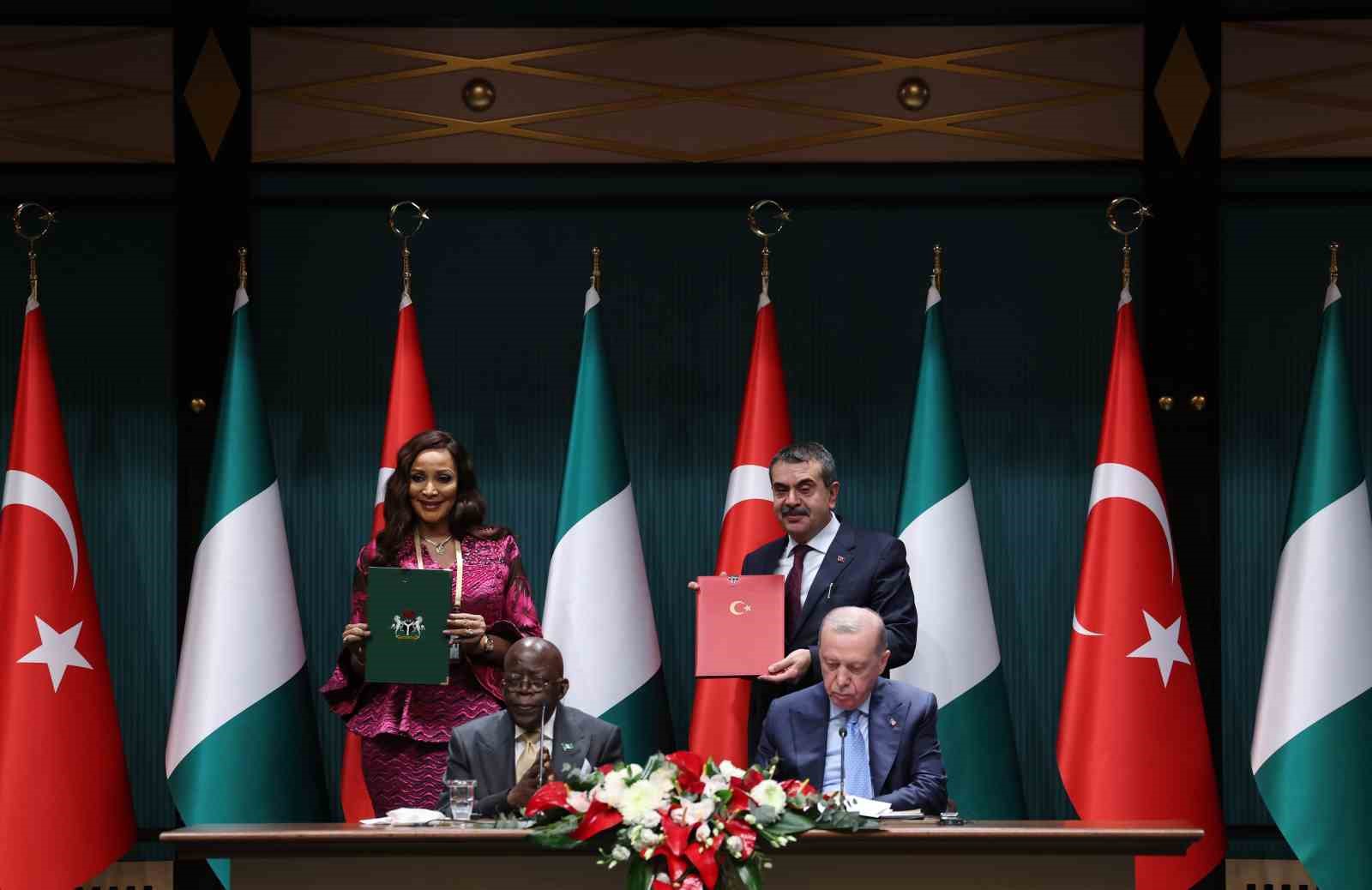 “Türkiye Cumhuriyeti Kültür ve Turizm Bakanlığı Yurtdışı Türkler ve Akraba Topluluklar Başkanlığı ile Diasporadaki Nijeryalılar Komisyonu Arasında Diaspora Siyasası Alanında İşbirliği Mutabakat Zaptı. Türkiye Cumhuriyeti Hükümeti ile Nijerya Federal Cumhuriyeti Hükümeti Arasında Medya ve İletişim Alanında Mutabakat Zaptı. Türkiye Cumhuriyeti ile Nijerya Federal Cumhuriyeti Yükseköğretim Alanında İşbirliğine İlişkin Mutabakat Zaptı. Türkiye Cumhuriyeti Helal Akreditasyon Kurumu ile Nijerya Ulusal Akreditasyon Sistemi Arasında Helal Kalite Altyapısı Alanında Mutabakat Zaptı. Ekonomi ve Ticaret Ortak Komitesi (JETCO) Tesis Eden Ortak Bildiri. Türkiye Cumhuriyeti Hükümeti ile Nijerya Federal Cumhuriyeti Hükümeti Arasında Askeri İşbirliği Protokolü. Türkiye Cumhuriyeti Hükümeti ile Nijerya Federal Cumhuriyeti Hükümeti Arasında Eğitim Alanında İşbirliği Anlaşması. Türkiye Cumhuriyeti Dışişleri Bakanlığı Diplomasi Akademisi ile Nijerya Federal Cumhuriyeti Dışişleri Bakanlığı Dışişleri Akademisi Arasında İşbirliği Mutabakat Zaptı. Türkiye Cumhuriyeti Aile ve Sosyal Politikalar Bakanlığı ile Nijerya Federal Cumhuriyeti Kadın İşleri Bakanlığı Arasında İşbirliğine Dair Mutabakat Zaptı.”