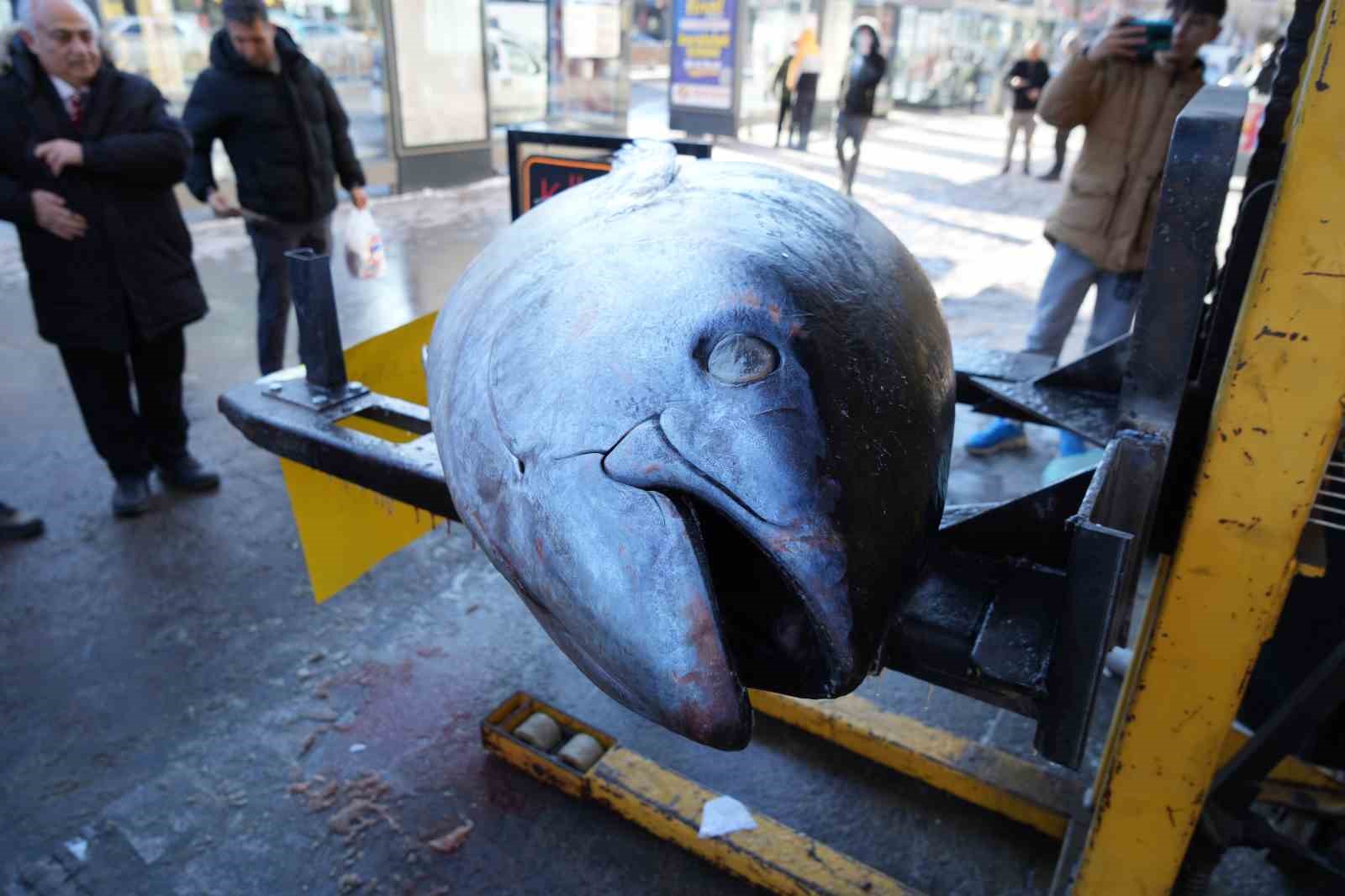 Atlantik Okyanusu’ndan avlanan 365 kiloluk dev orkinos Erzincan’da balık tezgâhında sergilendi. 3 metre uzunluğundaki balık vatandaşların ilgisini çekerken kilosu 500 TL’den satışa sunuldu.