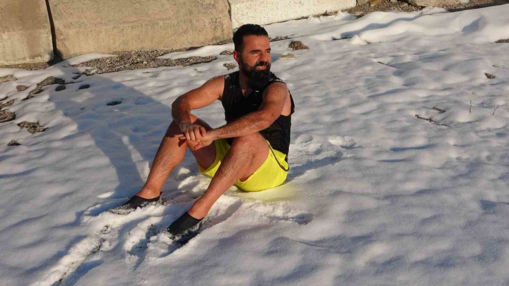 Doğu Anadolu Bölgesi’nde kış şartları yüzünü iyice gösterirken, Van’da görev yapan 2 öğretmen, sıradışı bir olaya imza attı. Dondurucu soğuğa aldırış etmeden Van Gölü’nün şifalı ve soğuk sularına dalan Muhammed Türken ve meslektaşı Kamuran Çelik, hava sıcaklığının sıfırın altında 9 dereceye kadar düştüğü kentte, yüzdükten sonra kar üstünde güneşlenmesi ilgiyle izlendi. Akşam saatlerinde Edremit ilçesi sahilinde bir araya gelen Türken ve Çelik, termometrelerin eksi 9 dereceyi gösterdiği dakikalarda kendilerini Van Gölü’nün turkuaz sularına bıraktı. Türken’in sosyal medya hesabından canlı paylaştığı o anlar büyük ilgi gördü.
