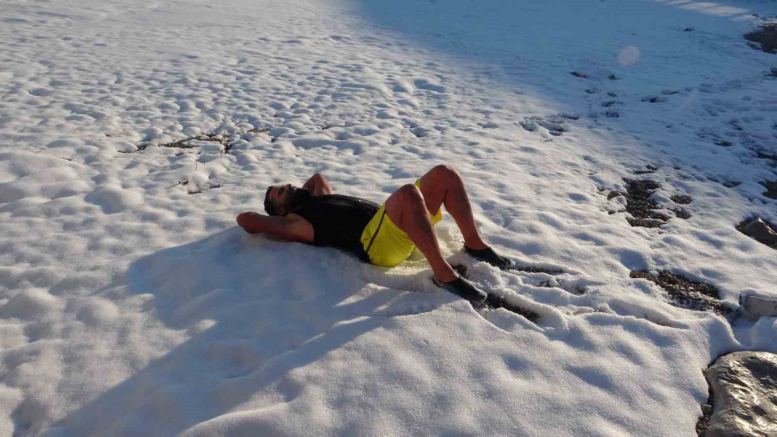 Hava sıcaklığının eksi 9 dereceye kadar düştüğü Van’da 2 öğretmen, Van Gölü’nün soğuk sularına girerek yüzdükten sonra kar üstünde güneşlendi.