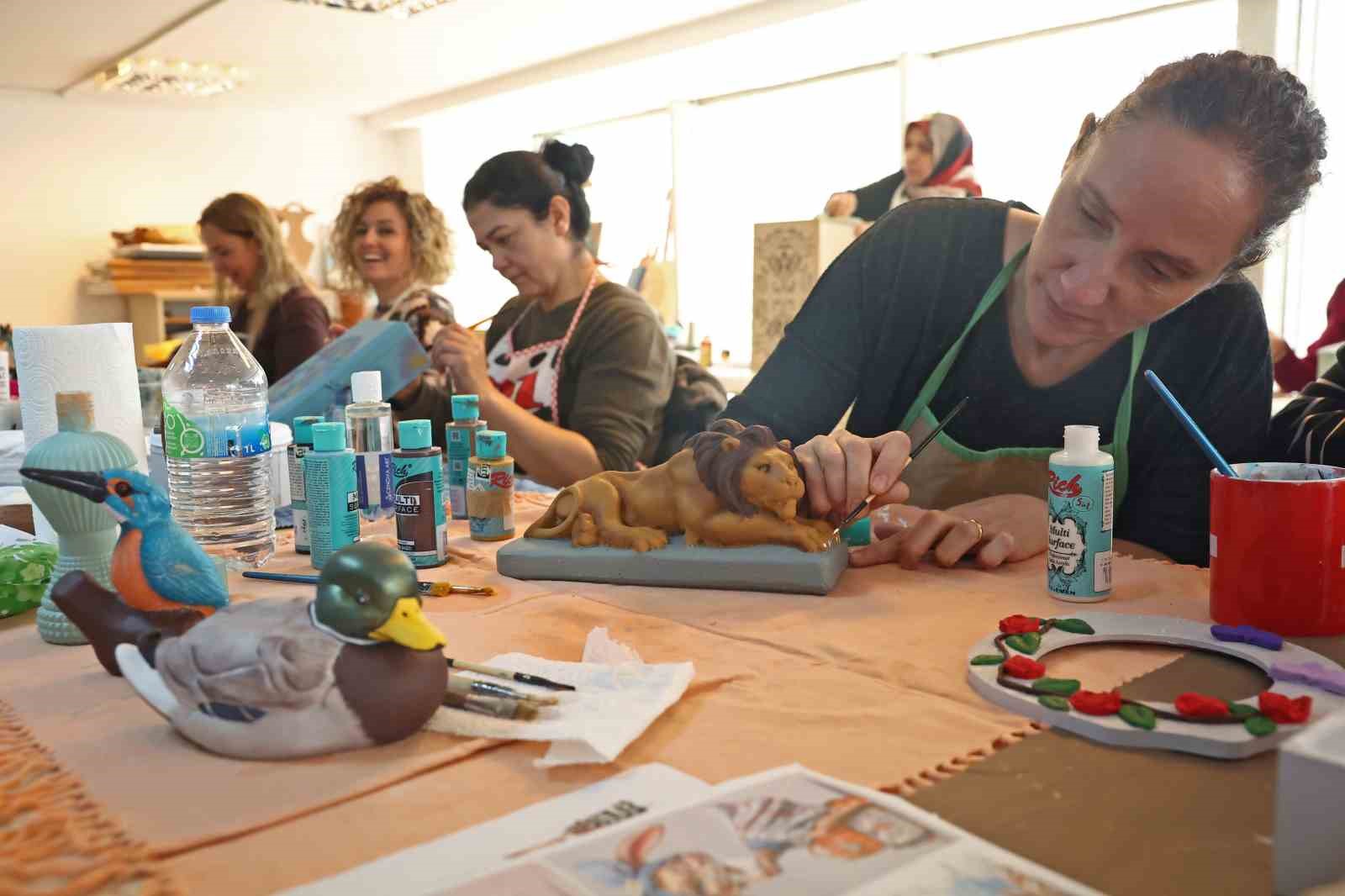 Dekoratif Ahşap Süsleme kursunda ise kursiyerler, dekoratif ahşap boyama teknikleri ve süsleme tekniklerini öğreniyor. Kursta geri dönüşüm ve sürdürülebilirlik kapsamında yenilenen ahşap ürünler süsleniyor. Yoğun ilgi gören kursta kursiyerler eski ahşapları birbirinden güzel sanat eserine çeviriyor. Kursiyerlerden 78 yaşındaki Mediha Kurt, “Evdeki eski objelerimizi dönüştürüyor, onları süslüyoruz. Yaptığımız ürünler, el emeği olduğu için çok değerli. Bu el yapımı ürünler dostlarımıza verebileceğimiz en güzel hediye oluyor ve onlar da gerçekten çok beğeniyor” dedi.