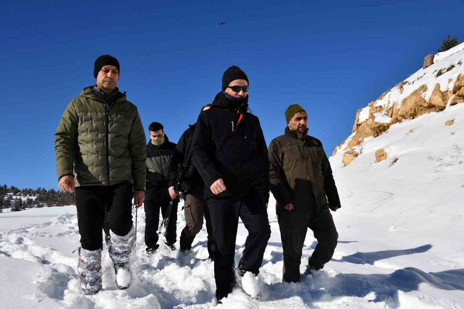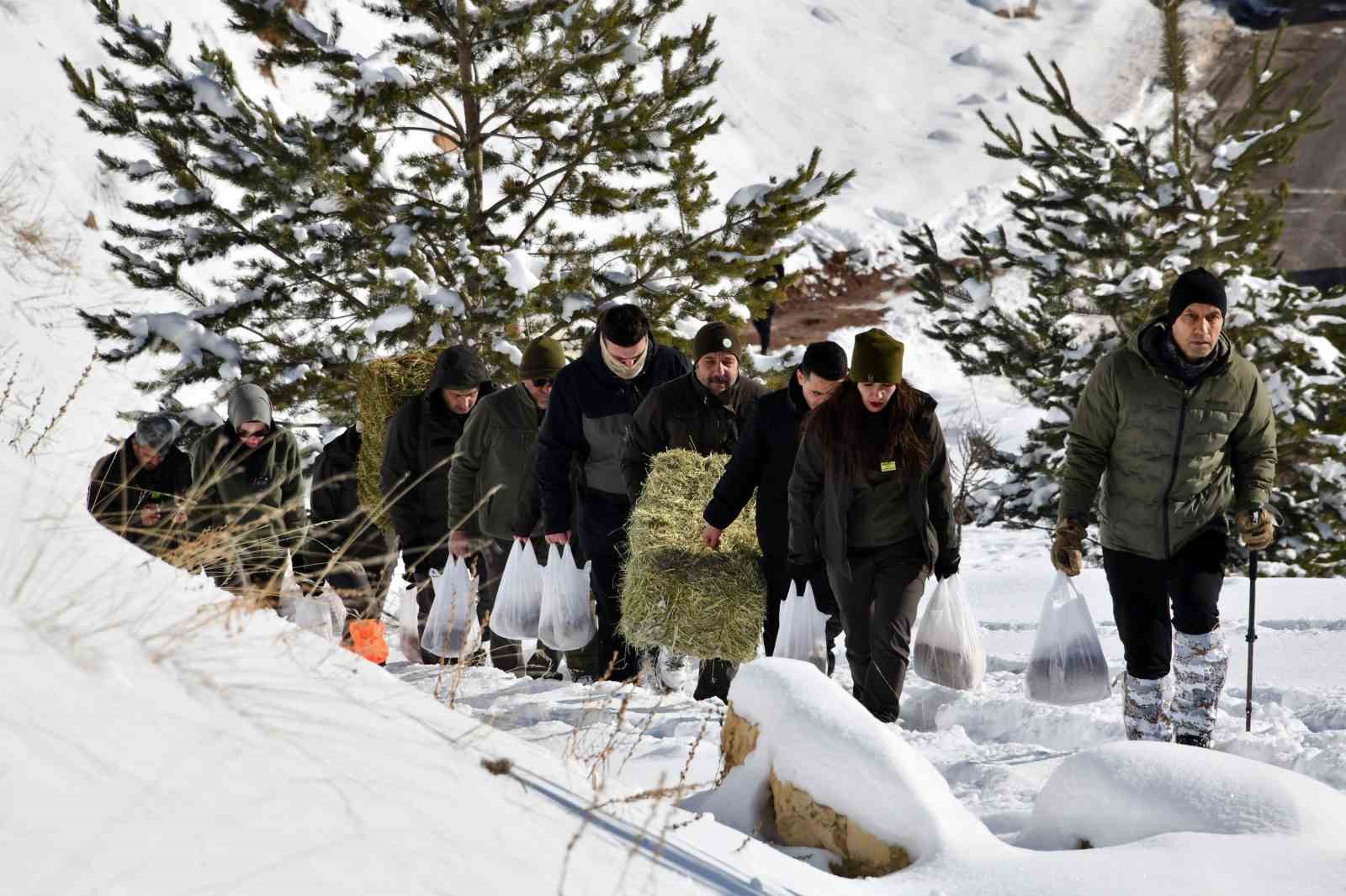 Ekiplerle omuz omuza vererek karla kaplı zeminde ot ve buğday çuvallarını taşıyan Vali Aydın Baruş, bu malzemeleri başta yaban keçileri olmak üzere yaban hayvanlarının kolaylıkla ulaşabileceği ve güvenle beslenebileceği şekilde bıraktı.