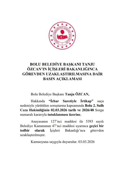 İçişleri Bakanlığı, Bolu Belediye Başkanı Tanju Özcan’ın “İcbar Suretiyle İrtikap” soruşturması kapsamında tutuklanmasının ardından Anayasa ve Belediye Kanunu uyarınca geçici tedbirle görevden uzaklaştırıldığını duyurdu.
