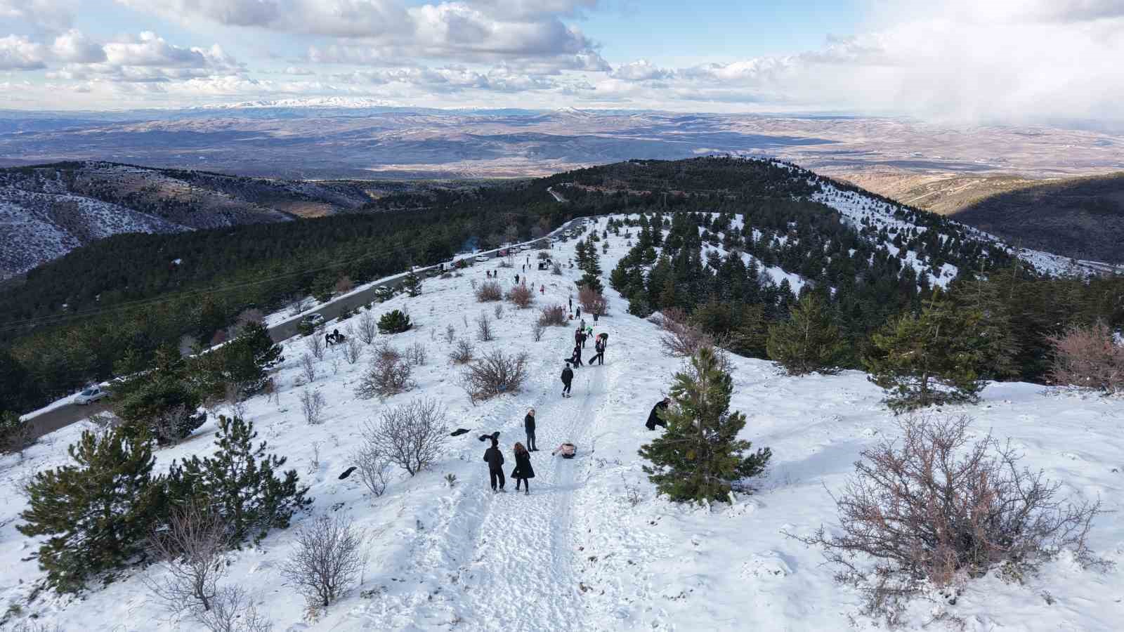 Kırıkkale’de şehir merkezinde kar yağışının etkili olmaması üzerine vatandaşlar, bin 744 rakımlı Dinek Dağı’nın zirvesine çıkarak kış manzarasının keyfini yaşadı. Aileleriyle birlikte zirveye çıkan vatandaşlar, yüksek kesimlerde etkili olan kar yağışıyla doğayla iç içe vakit geçirdi.