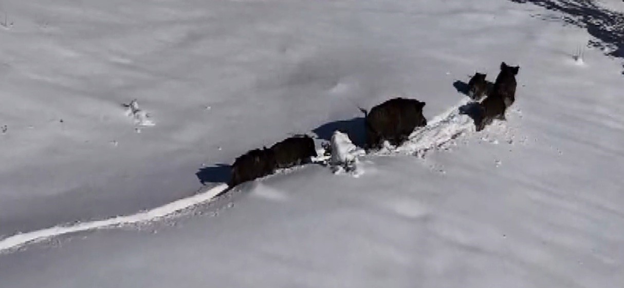 Drone kamerasına yansıyan görüntülerde, yaban domuzlarının kalın kar örtüsü üzerinde koşarak ilerlediği, zaman zaman duraksadığı ve yön değiştirerek birlikte hareket ettiği görüldü. Karla kaplı arazide uyum içinde hareket eden sürü, bir süre sonra dağlık alana doğru yönelerek gözden kayboldu.