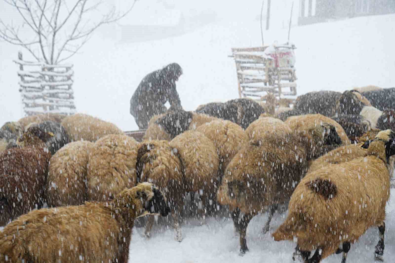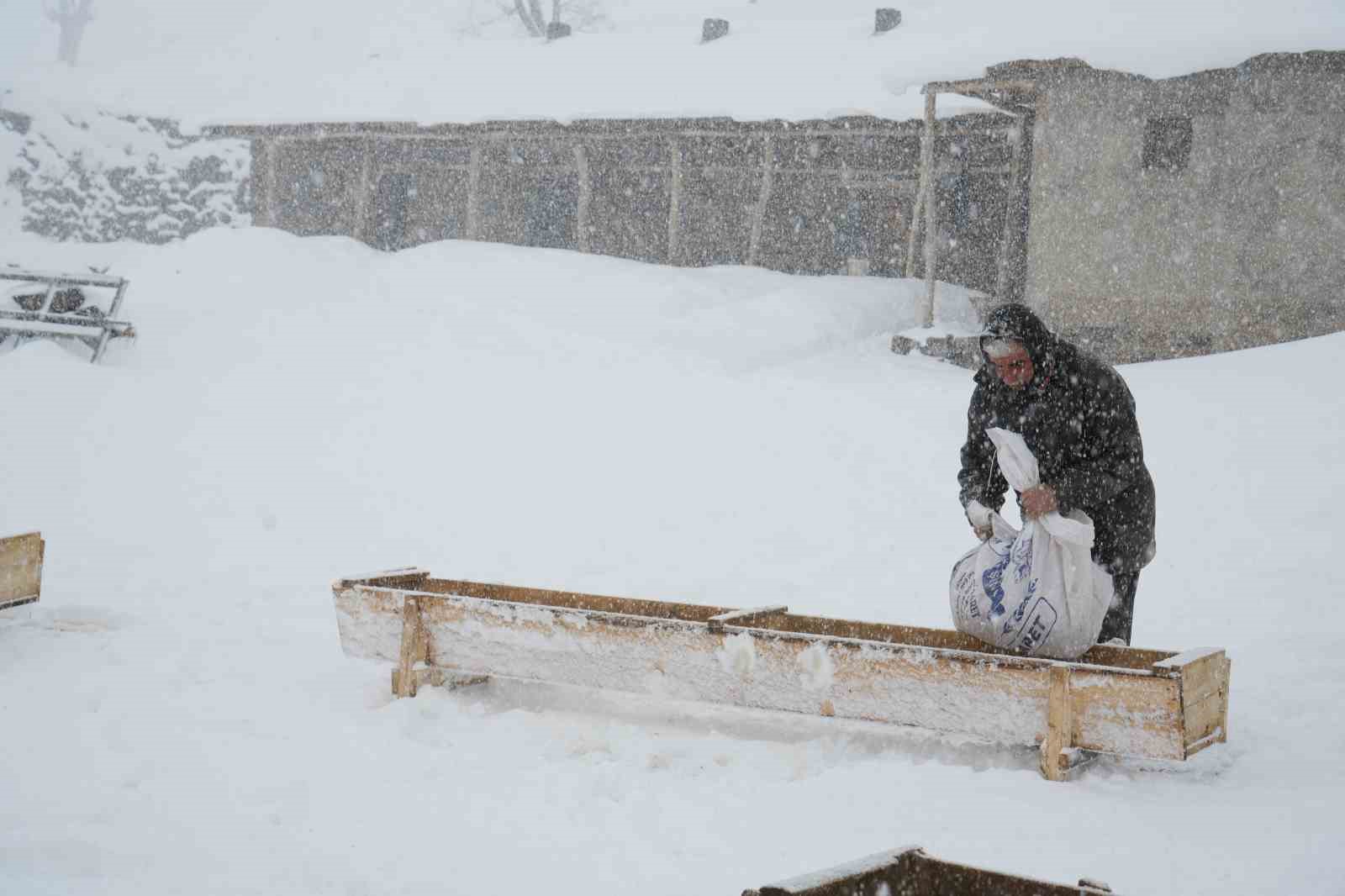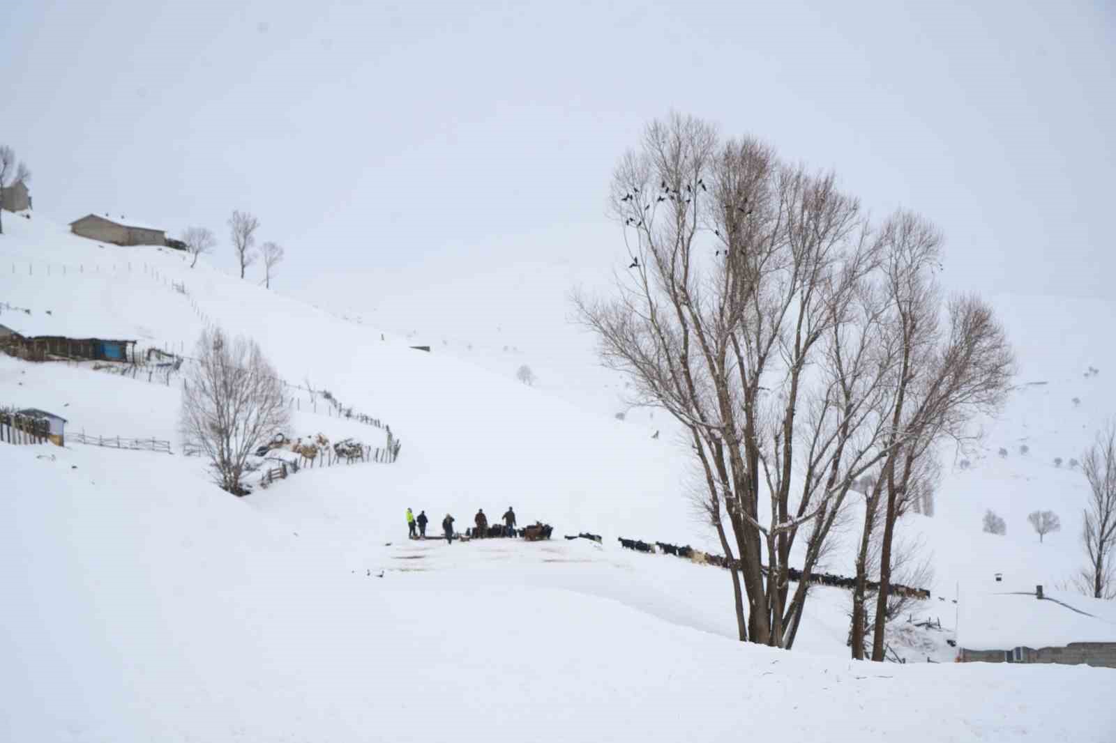 Yılın yaklaşık 6 ayını kar altında geçiren bölgede besiciler, dondurucu soğuk ve tipiye rağmen sırtlarında yem taşıyarak hayvanlarını ayakta tutmaya çalışıyor. Zorlu kış şartlarına rağmen üreticiler, tek geçim kaynakları olan hayvancılığı sürdürmek için büyük bir özveriyle mücadele ediyor.