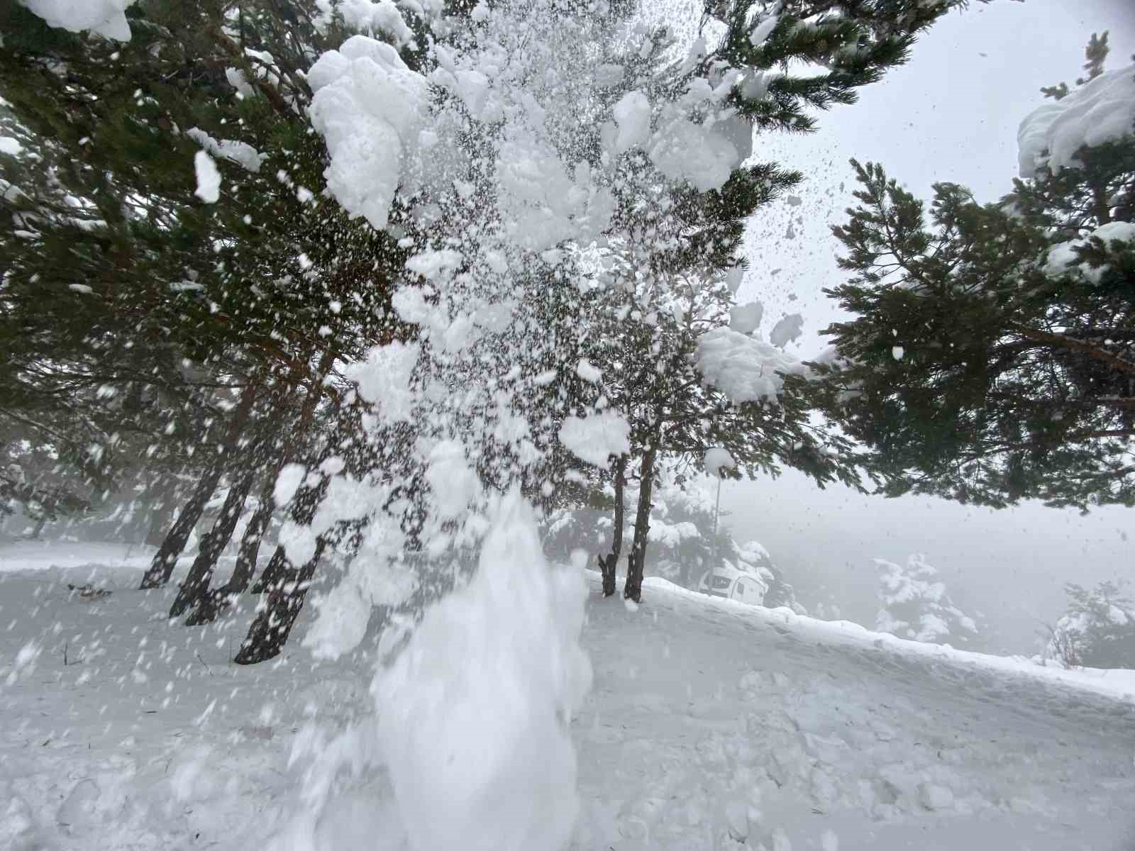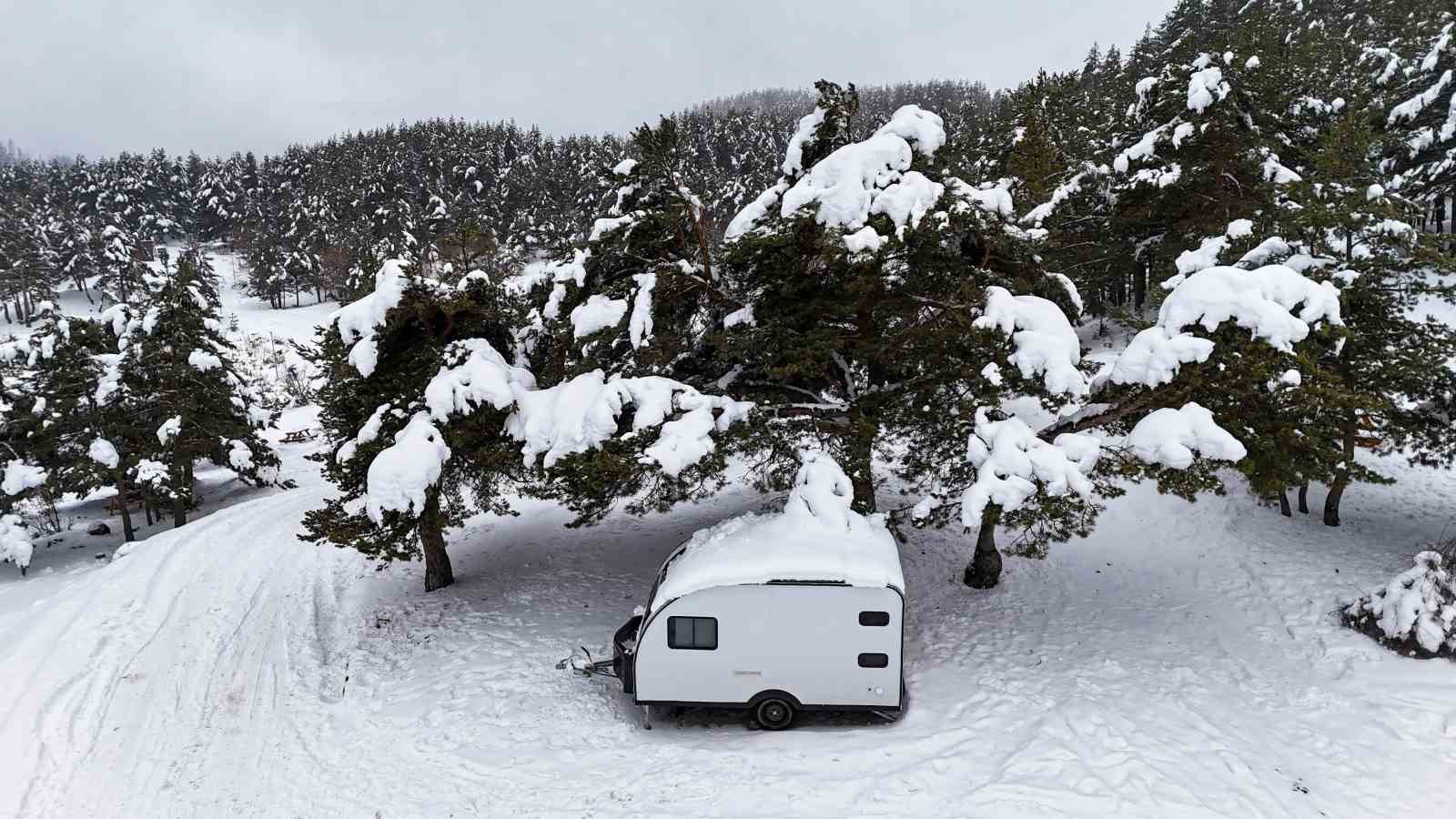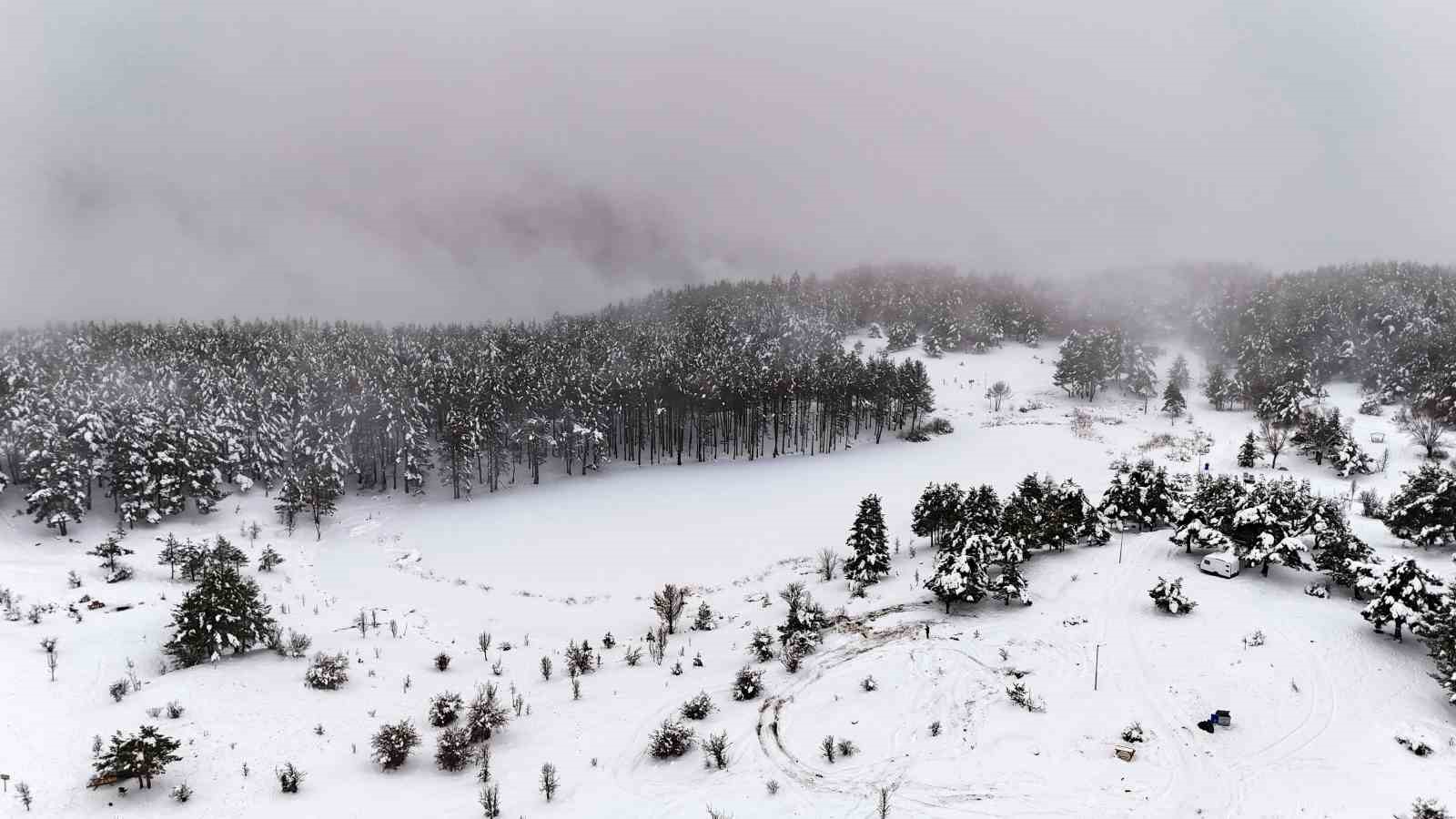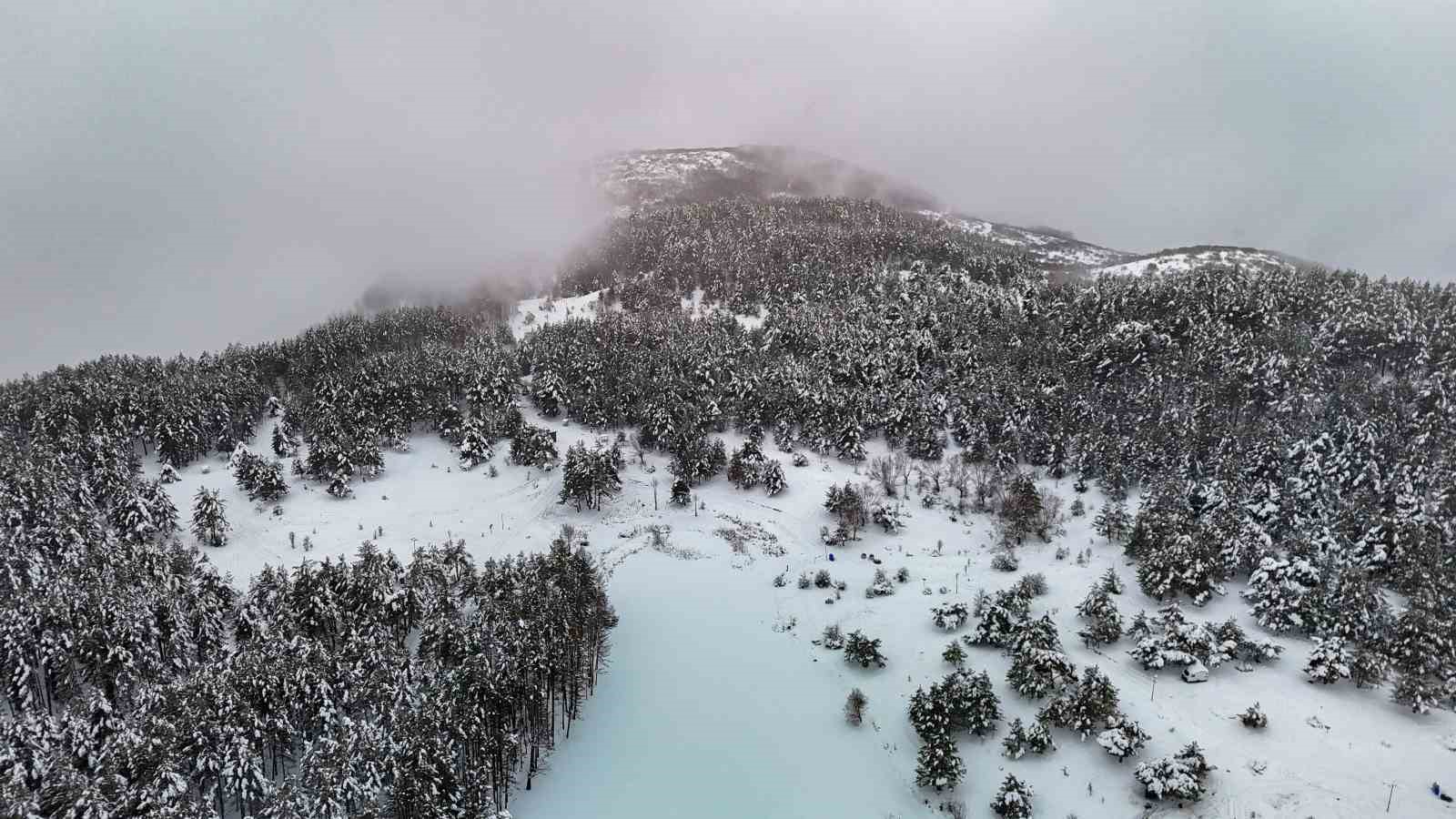 Ankara’nın Kızılcahamam ilçesinde bulunan Işık Dağı eteklerindeki Karagöl Jeositi, kar yağışıyla beyaza bürünürken, kış tatilini doğayla iç içe geçirmek isteyen Başkentlilerin yeni adresi Uludağ yerine Işık Dağı oldu.