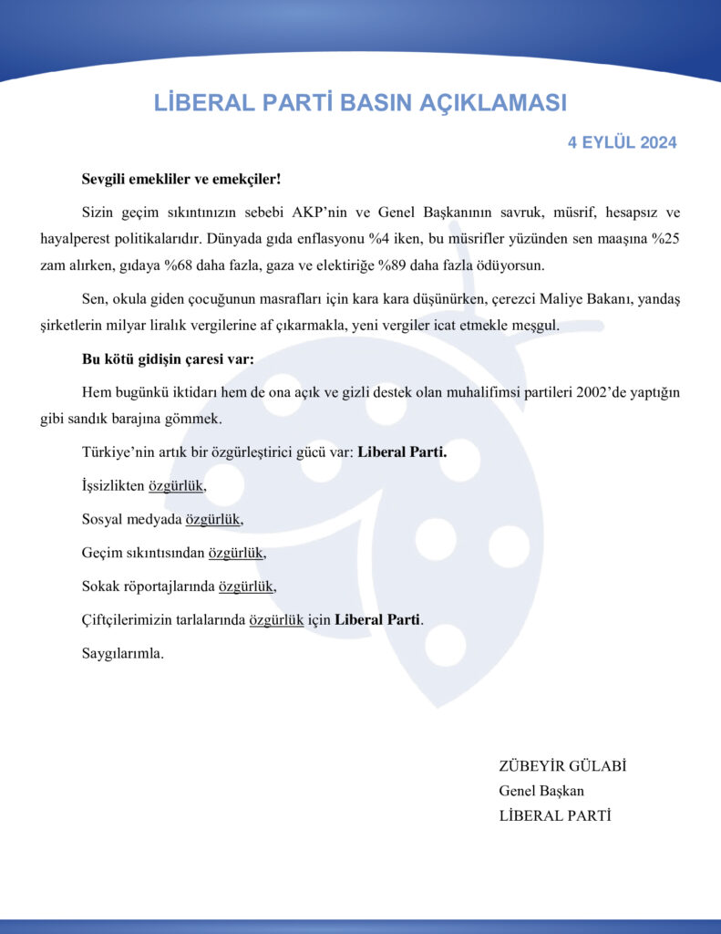 Emeklilerin geçim sıkıntısının AKP’nin savruk politikalarından kaynaklandığını söyleyen Gülabi, bu kötü gidişatın çözümü olarak Liberal Parti’ye destek verilmesini önerdi. Liberal Parti’nin, geçim sıkıntısı, işsizlik ve sosyal özgürlükler konularında etkili çözümler sunacağını vurguladı.