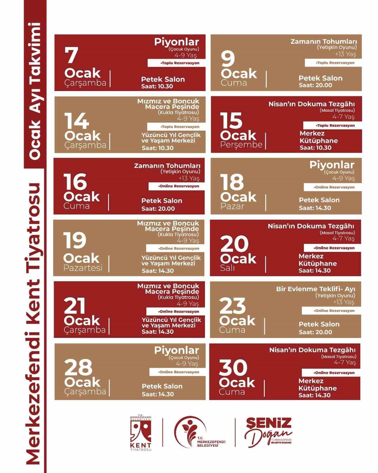 Merkezefendi Kent Tiyatrosu’nun, Ocak ayındaki oyun takvimi ise şöyle; Tiyatro ekibi ardından ‘Zamanın Tohumları’ oyununu 9 Ocak Cuma günü saat 20.00’de Merkezefendi Kültür Merkezi’nde, ‘Mızmız ve Boncuk Macera Peşinde’ oyununu 14 Ocak Çarşamba günü saat 10.30’da Yüzüncü Yıl Gençlik Merkezi’nde, ‘Nisan’ın Dokuma Tezgâhı’ oyunu 15 Ocak Perşembe günü saat 10.30’da Merkez Kütüphane’de, ‘Zamanın Tohumları’ oyununu 16 Ocak Cuma günü saat 20.00’de Merkezefendi Kültür Merkezi’nde, ‘Piyonlar’ oyunu 18 Ocak Pazar günü saat 14.30’da Merkezefendi Kültür Merkezi’nde, ‘Mızmız ve Boncuk Macera Peşinde’ oyununu 19 Ocak Pazartesi günü saat 14.30’da Yüzüncü Yıl Gençlik Merkezi’nde, ‘Nisan’ın Dokuma Tezgâhı’ oyununu 20 Ocak Salı günü saat 14.30’da Merkez Kütüphane’de, ‘Mızmız ve Boncuk Macera Peşinde’ oyununu 21 Ocak Çarşamba günü saat 14.30’da Yüzüncü Yıl Gençlik Merkezi’nde, ‘Bir Evlenme Teklifi – Ayı’ oyununu 23 Ocak Cuma günü saat 20.00’de Merkezefendi Kültür Merkezi’nde, ‘Piyonlar’ oyununu 28 Ocak Çarşamba günü 14.30’da Merkezefendi Kültür Merkezi’nde ve Nisan’ın Dokuma Tezgâhı’ oyununu 30 Ocak Cuma günü saat 14.30’da Merkez Kütüphane’de gerçekleştirilecek.