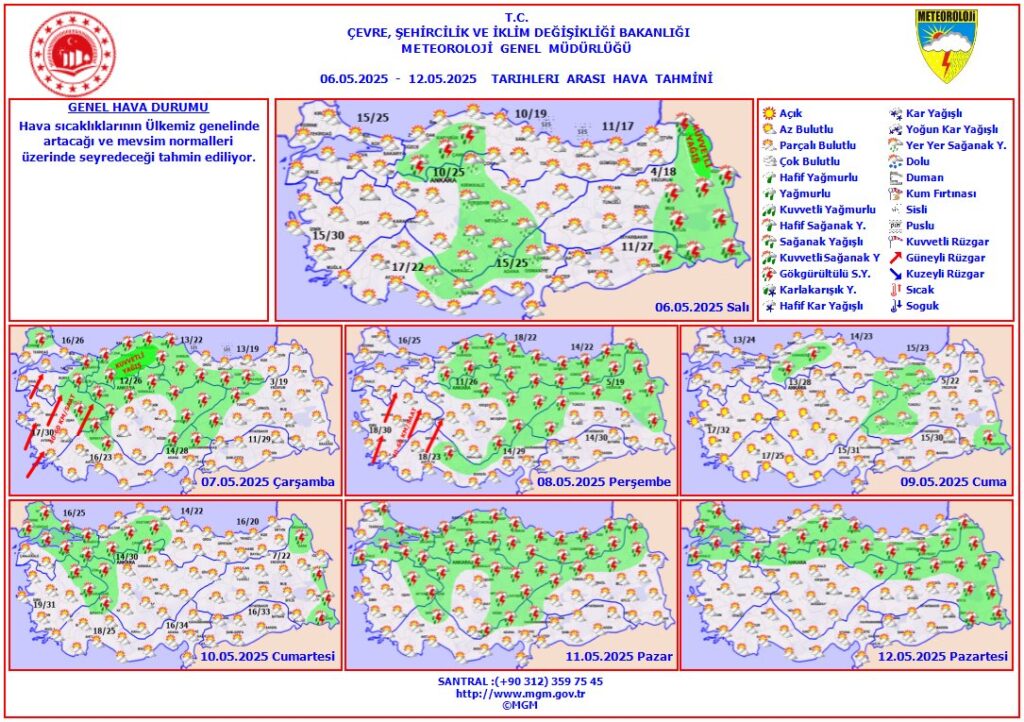 Meteoroloji Genel Müdürlüğü, 5 – 11 Mayıs 2025 tarihlerini kapsayan haftalık hava durumu tahmin raporunu yayımladı. Türkiye genelinde sıcaklıklar artıyor, yaz erken geliyor! Mevsim normallerinin üzerine çıkacak hava sıcaklıkları, özellikle batı ve güney bölgelerde 35°C’ye yaklaşacak. Ancak doğu ve iç kesimlerde yer yer sağanak yağışlar bekleniyor.
