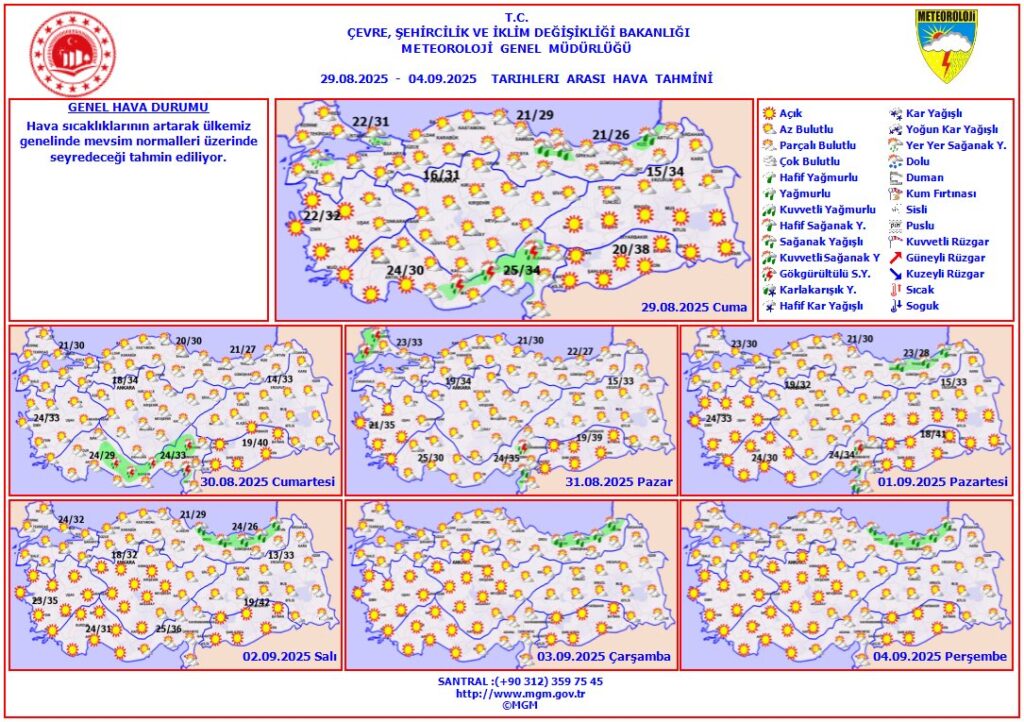 Meteoroloji Genel Müdürlüğü, 29 Ağustos – 4 Eylül 2025 tarihleri arasındaki hava durumu tahminlerini açıkladı. Ülke genelinde sıcaklıkların artarak mevsim normallerinin üzerinde seyredeceği belirtiliyor.