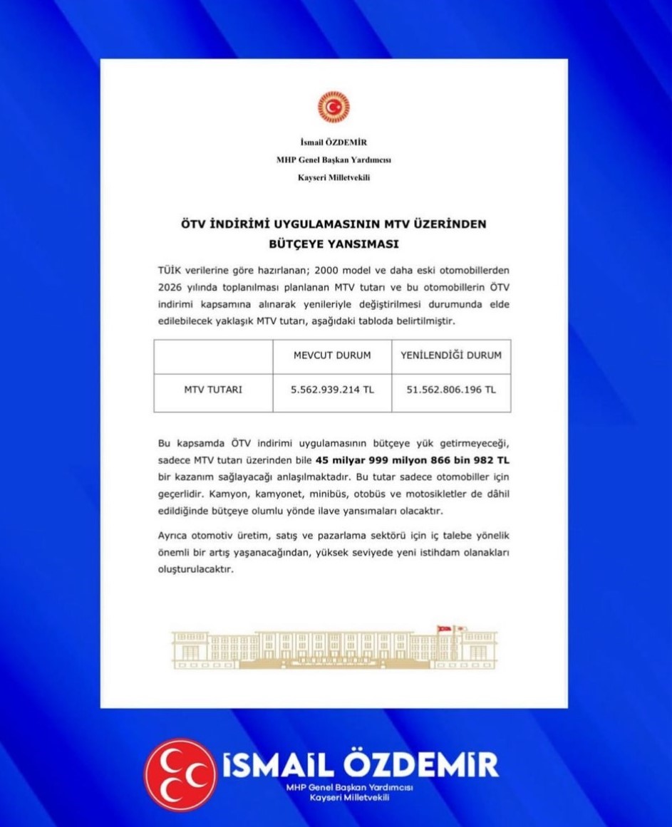 Özdemir, sosyal medya hesabından yaptığı paylaşımda, “TBMM’ye sunduğumuz ve 2000 yılı öncesinde trafiğe kayıtlı araçların yerli üretim araçlarla yenilenmesini öngören kanun teklifimizle trafik güvenliğinin pekiştirilmesi, çevreci araçların teşvik edilerek kullanımının yaygınlaştırılması, ekonomik gelişmelere pozitif yönde katkı sağlanması hedeflerimizi ortaya koymuştuk. Teklifle ilgili bazı kamu kuruluşlarının olumlu yönde görüşe sahip olduğunu bilmekle beraber, ÖTV hususunda kayba neden olacağı endişelerinin ise yersiz bir yaklaşım olacağını ifade etmek gerekir. Zira ÖTV teşvikinin sağlanması ile oluşacak herhangi bir kayıp bulunmamaktadır. Aksine, kanunun gerçekleşmesi halinde ise bilhassa MTV gelirlerindeki yüksek artış sebebiyle bütçemize de olumlu yönde katkısı olacaktır. Bu yönüyle 2026 yılı içerisinde teklif ettiğimiz kanunun yasalaşması halinde merkezi bütçemize 45 milyar liradan fazla ilave bir kaynak sağlanmış olacaktır. Üstelik iç pazar hareketlenmesi ile otomotiv sektörü ve bağlı olan diğer alanlarda ilave istihdam da oluşturabilecektir. Vatandaşlarımızın ihtiyaç ve beklentisi çerçevesinde sunduğumuz kanun teklifimizin kabul edilerek, yürürlülüğe girmesi için gayretle çalışmalarımızı sürdürüyoruz” dedi.