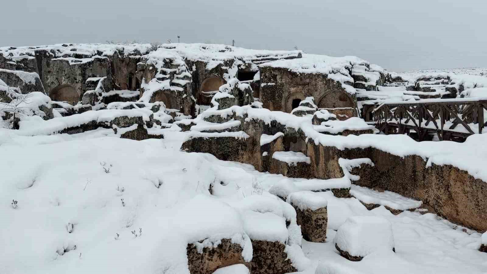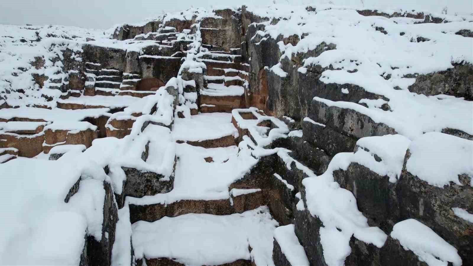 Kommagene Uygarlığı’nın 5 büyük kentinden biri olarak bilinen Perre Antik Kenti, Adıyaman’da etkili olan kar yağışıyla birlikte beyaza bürünerek eşsiz bir manzaraya sahne oldu.