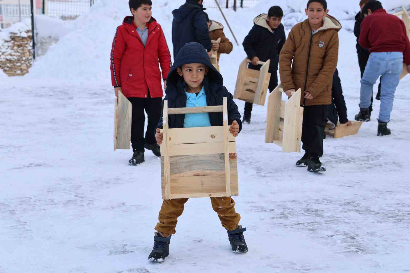 Sivas’ta bir köyde daha öncesinde poşet ve leğen ile kayan öğrencilere ahşap kızak hediye edildi. Ders arasında sokağa çıkan öğrenciler, ahşap kızakla kayarak doyasıya eğlendi.