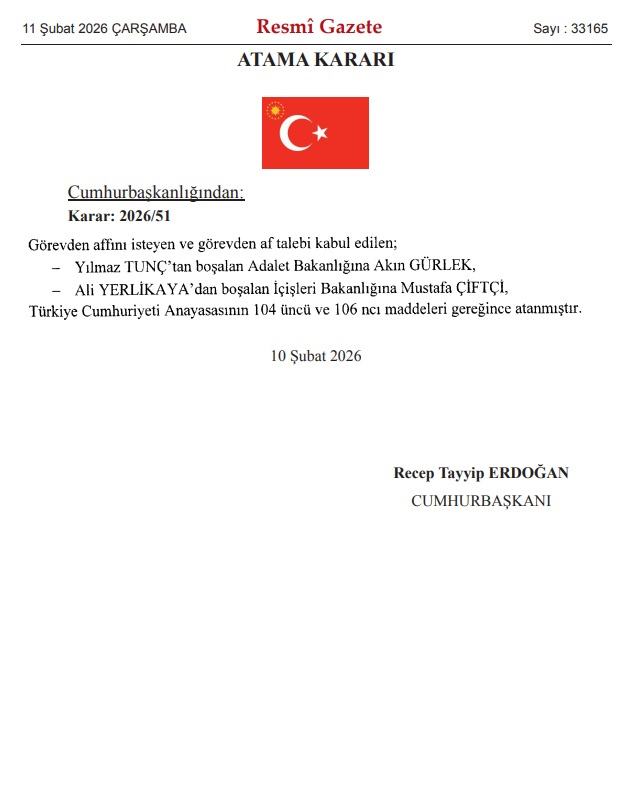 Resmî Gazete’nin 11 Şubat 2026 tarihli sayısında yayımlanan Cumhurbaşkanlığı Atama Kararı ile kabinede önemli değişiklikler yapıldı. Cumhurbaşkanı Recep Tayyip Erdoğan’ın imzasıyla yayımlanan karara göre, görevden affını isteyen Adalet Bakanı Yılmaz Tunç’tan boşalan göreve Akın Gürlek, İçişleri Bakanı Ali Yerlikaya’dan boşalan göreve ise Mustafa Çiftçi atandı.