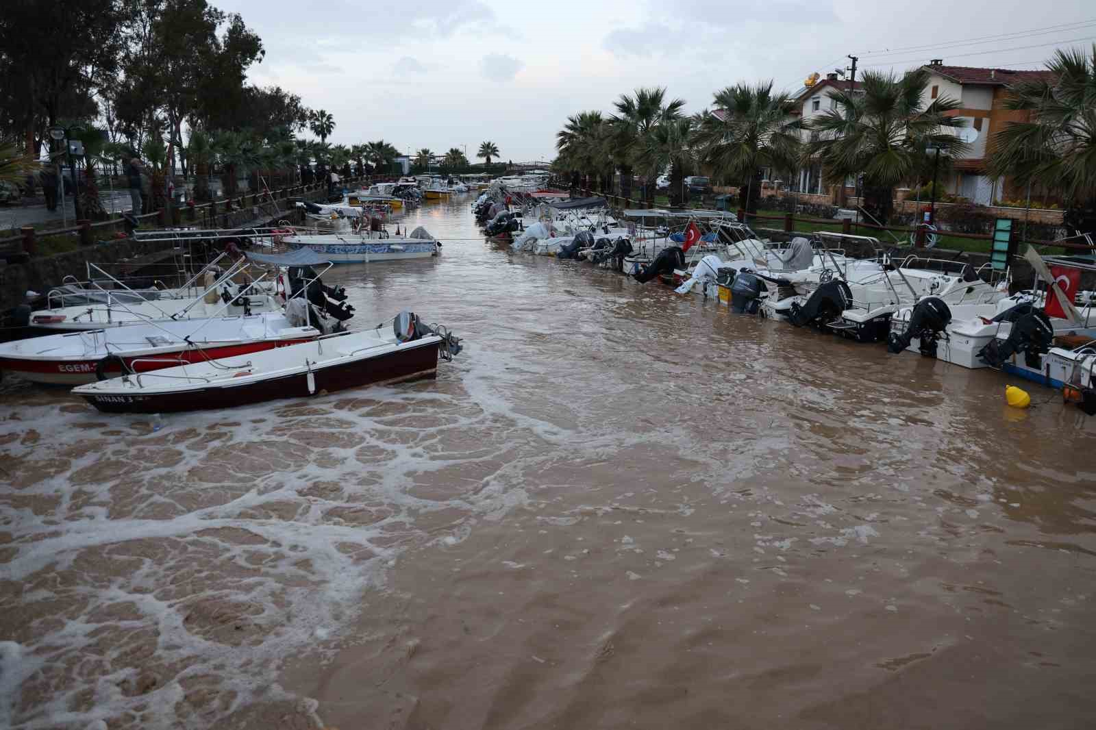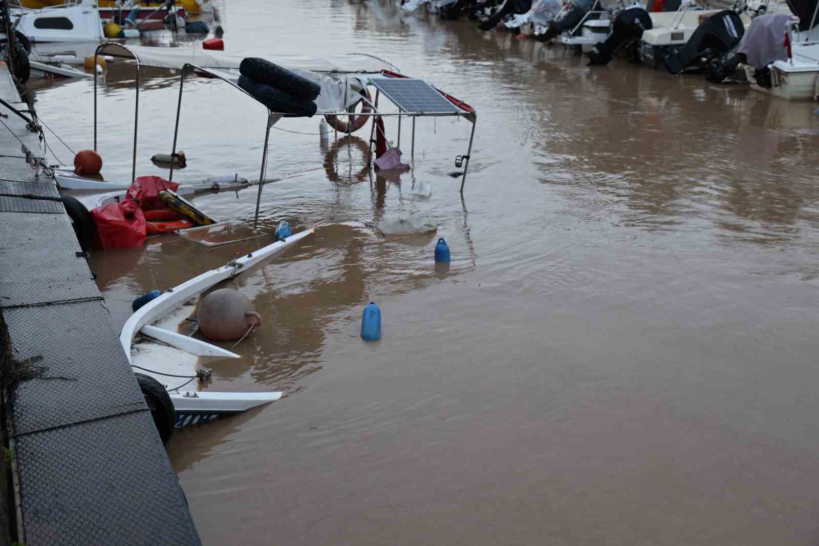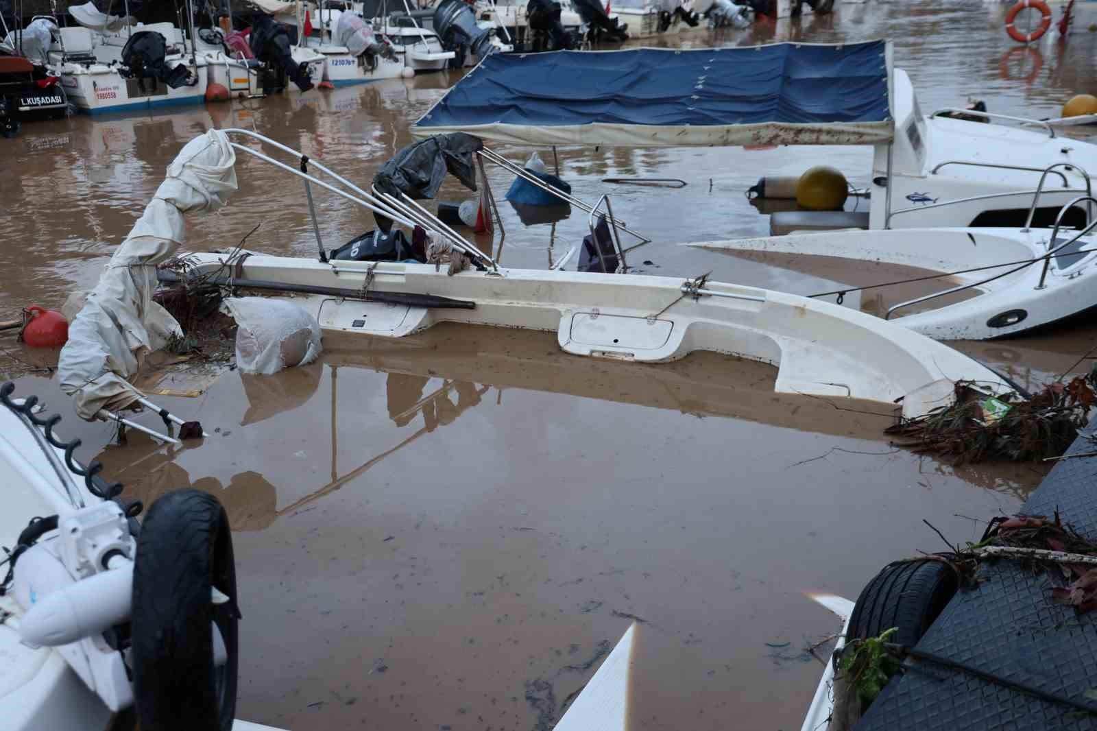 Aydın’ın Kuşadası ilçesinde etkili olan sağanak yağışla beraber oluşan sel sebebiyle Davutlar Balıkçı Barınağı’nda bağlı tekneler zarar görürken, bazı tekneler battı.