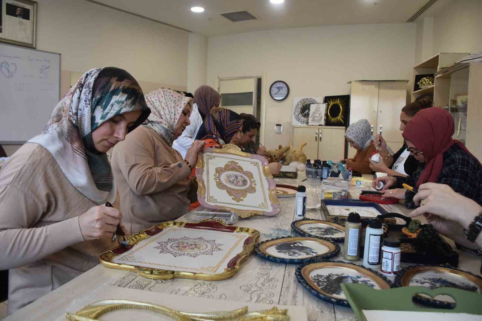 Evlerde atıl durumda bulunan ve kullanılmayan eşyalar, kursiyerlerin elinde yeniden hayat buluyor. Eski tepsiler, ahşap parçalar ve farklı materyaller, filografi, boyama ve rölyef teknikleriyle değerlendirilerek ekonomiye ve çevreye katkı sağlıyor.