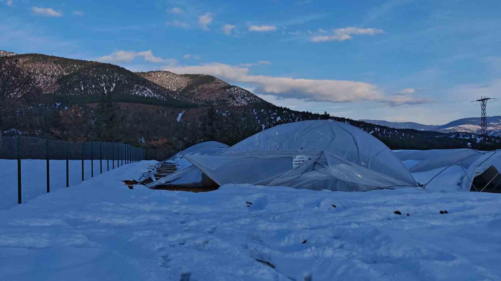 Eskipazar ilçesinde yoğun kar yağışının kısa sürede oluşturduğu ağır yük nedeniyle yaklaşık 50 dönümlük sera alanı çöktü. Güvenlik kamerası görüntülerinde, karın ağırlığına daha fazla dayanamayan seraların bir anda çöktüğü anlar net bir şekilde görülüyor.