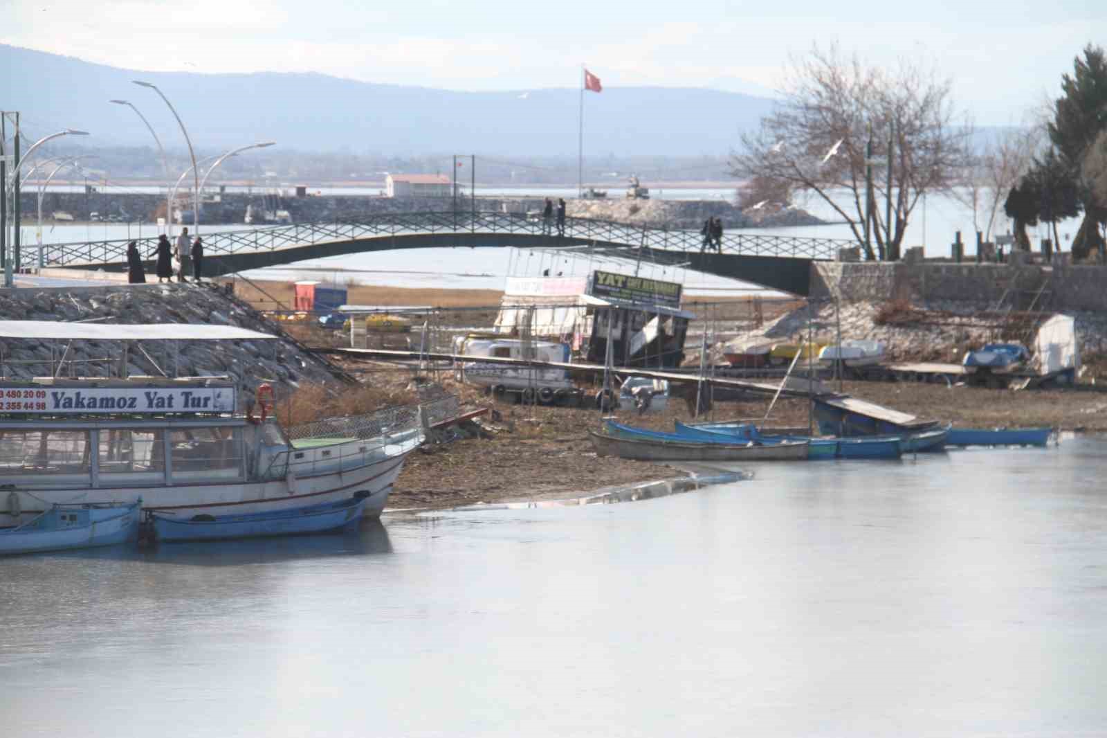 Konya’nın Beyşehir ilçesinde kar yağışının etkisini kaybetmesi sonrasında gelen şiddetli soğuklar Beyşehir Gölü kıyılarının donarak buzlarla kaplanmasına neden oldu.