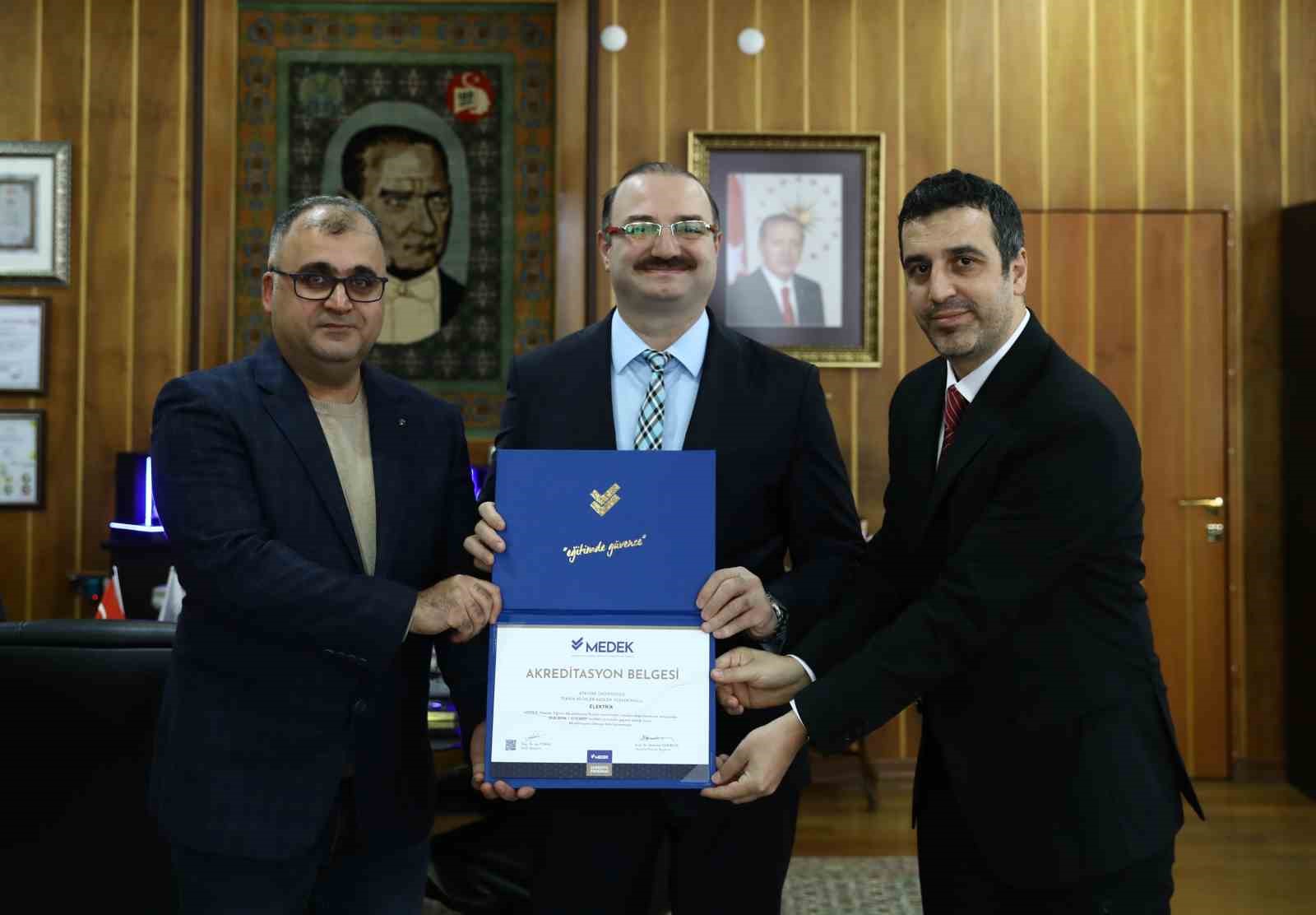 Törende konuşan Atatürk Üniversitesi Rektörü Prof. Dr. Ahmet Hacımüftüoğlu, mesleki eğitimin niteliğini artırmaya yönelik yürütülen çalışmaların somut çıktılarla taçlandırılmasından duyduğu memnuniyeti dile getirerek, akreditasyonun sadece bir belge değil, aynı zamanda sürdürülebilir kalite anlayışının bir göstergesi olduğunu vurguladı. Rektör Hacımüftüoğlu, değerlendirmesinde şu ifadelere yer verdi: “Meslek yüksekokullarımız, üniversitemizin uygulamalı eğitim vizyonunun en güçlü yapı taşlarıdır. Teknik Bilimler Meslek Yüksekokulumuzun birçok programının MEDEK tarafından akredite edilmesi, eğitim kalitemizin ulusal standartlar çerçevesinde tescillendiğinin açık bir göstergesidir. Bu süreçte emeği geçen tüm akademik ve idari personelimize teşekkür ediyor, akreditasyon kültürünü tüm birimlerimizde yaygınlaştırmayı hedeflediğimizi özellikle ifade etmek istiyorum.”