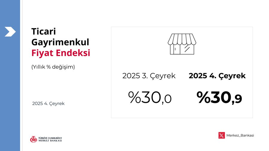 TCMB’nin 2025 yılı 4. çeyrek Ticari Gayrimenkul Fiyat Endeksi verilerine göre TGFE yıllık %30,9 arttı. Reel bazda ise %0,5 gerileme kaydedildi. Dükkan ve ofis fiyatlarındaki son durum haberimizde.
