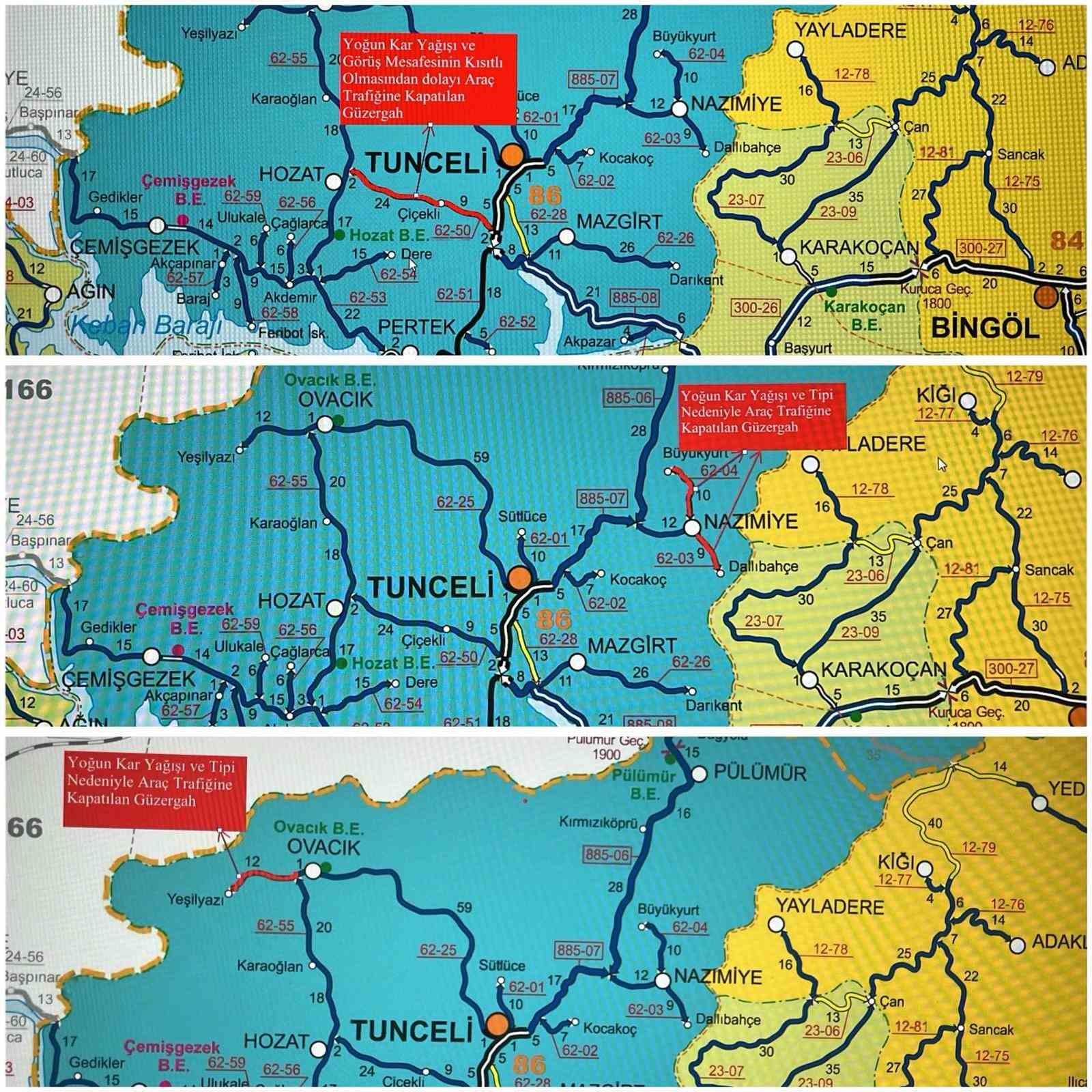 Tunceli genelinde etkisini artıran yoğun kar yağışı ve tipi, görüş mesafesini düşürdü. Olumsuz hava şartları nedeniyle Hozat, Nazımiye ve Ovacık güzergahlarında bulunan bazı il yolları geçici süreyle araç trafiğine kapatıldı.