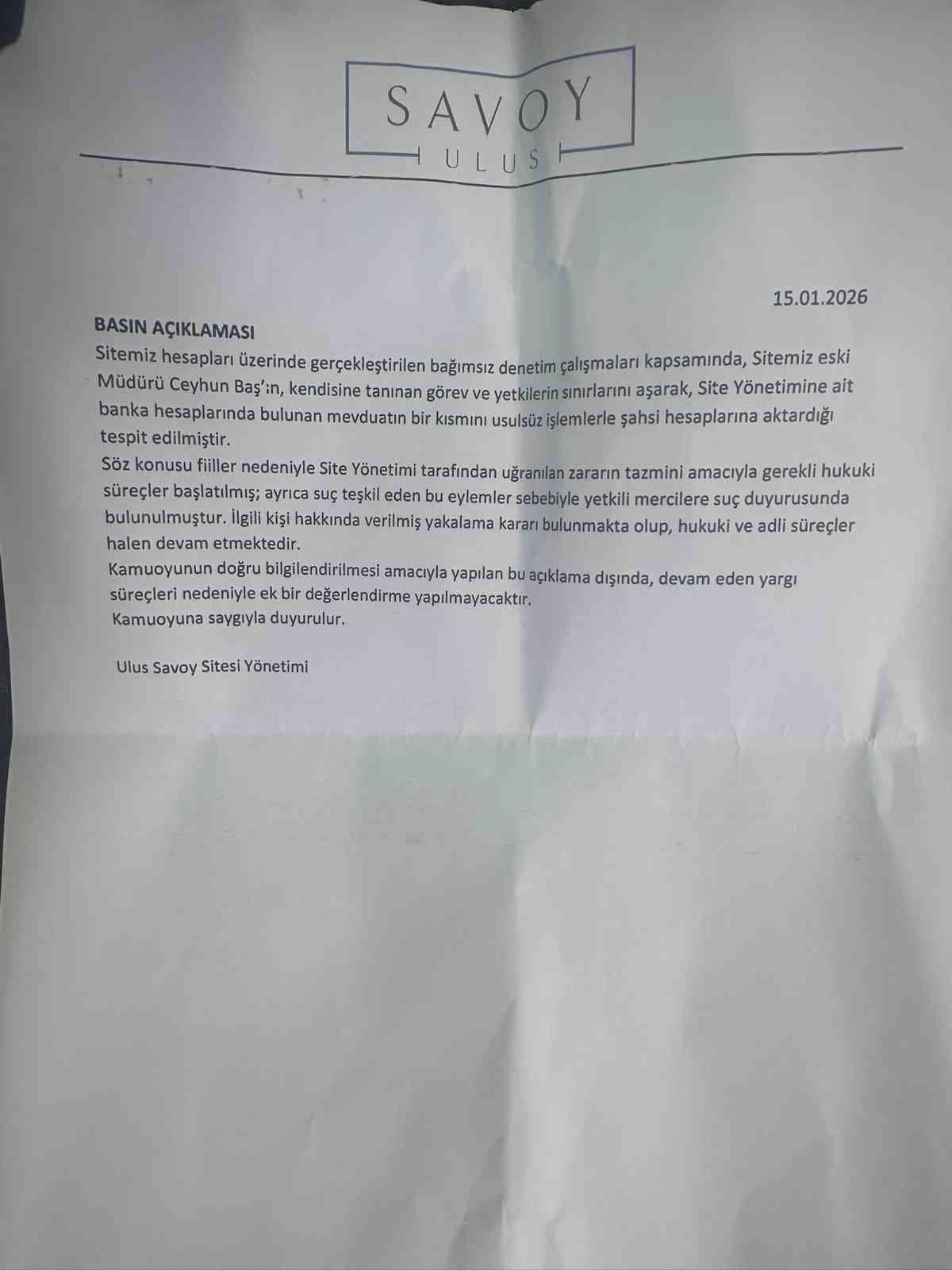 Açıklamada, “Sitemiz hesapları üzerinde gerçekleştirilen bağımsız denetim çalışmaları kapsamında, Sitemiz eski Müdürü Ceyhun Baş’ın, kendisine tanınan görev ve yetkilerin sınırlarını aşarak, site yönetimine ait banka hesaplarında bulunan mevduatın bir kısmını usulsüz işlemlerle şahsi hesaplarına aktardığı tespit edilmiştir” denildi.