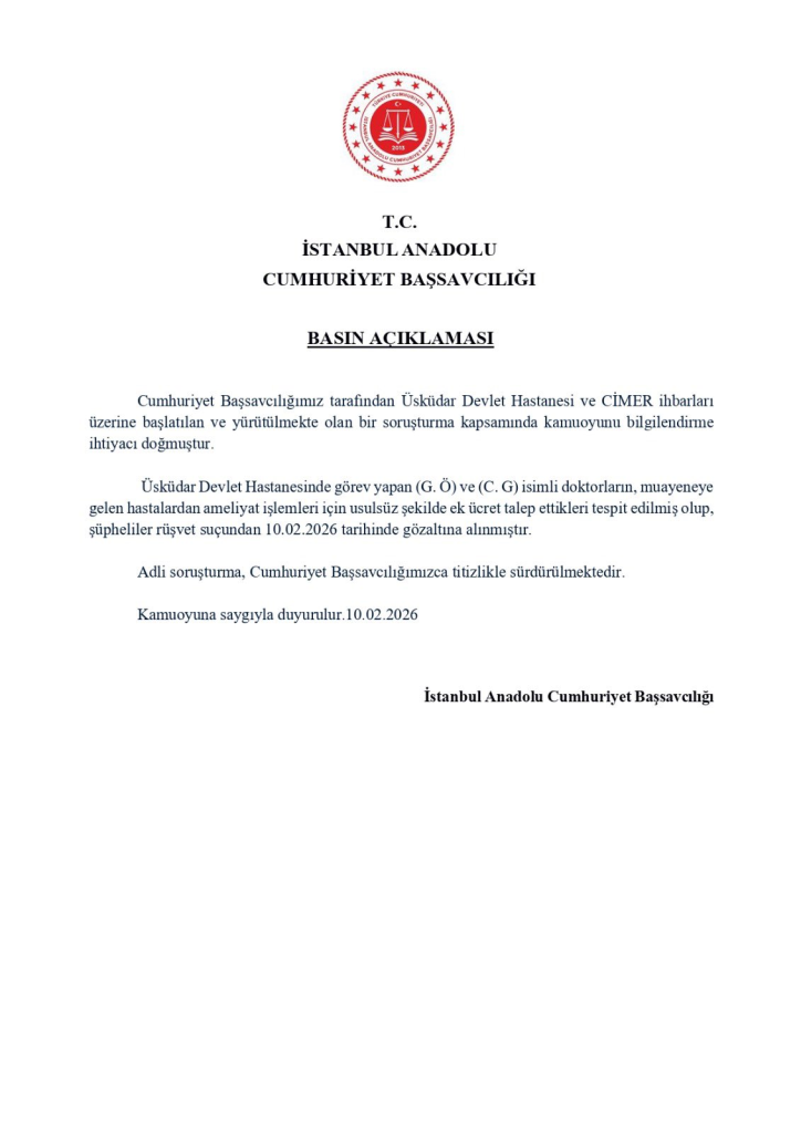 İstanbul Anadolu Cumhuriyet Başsavcılığı, Üsküdar Devlet Hastanesi’nde görevli iki doktorun ameliyat için usulsüz ek ücret talep ettiği iddiasıyla rüşvet suçundan gözaltına alındığını açıkladı.