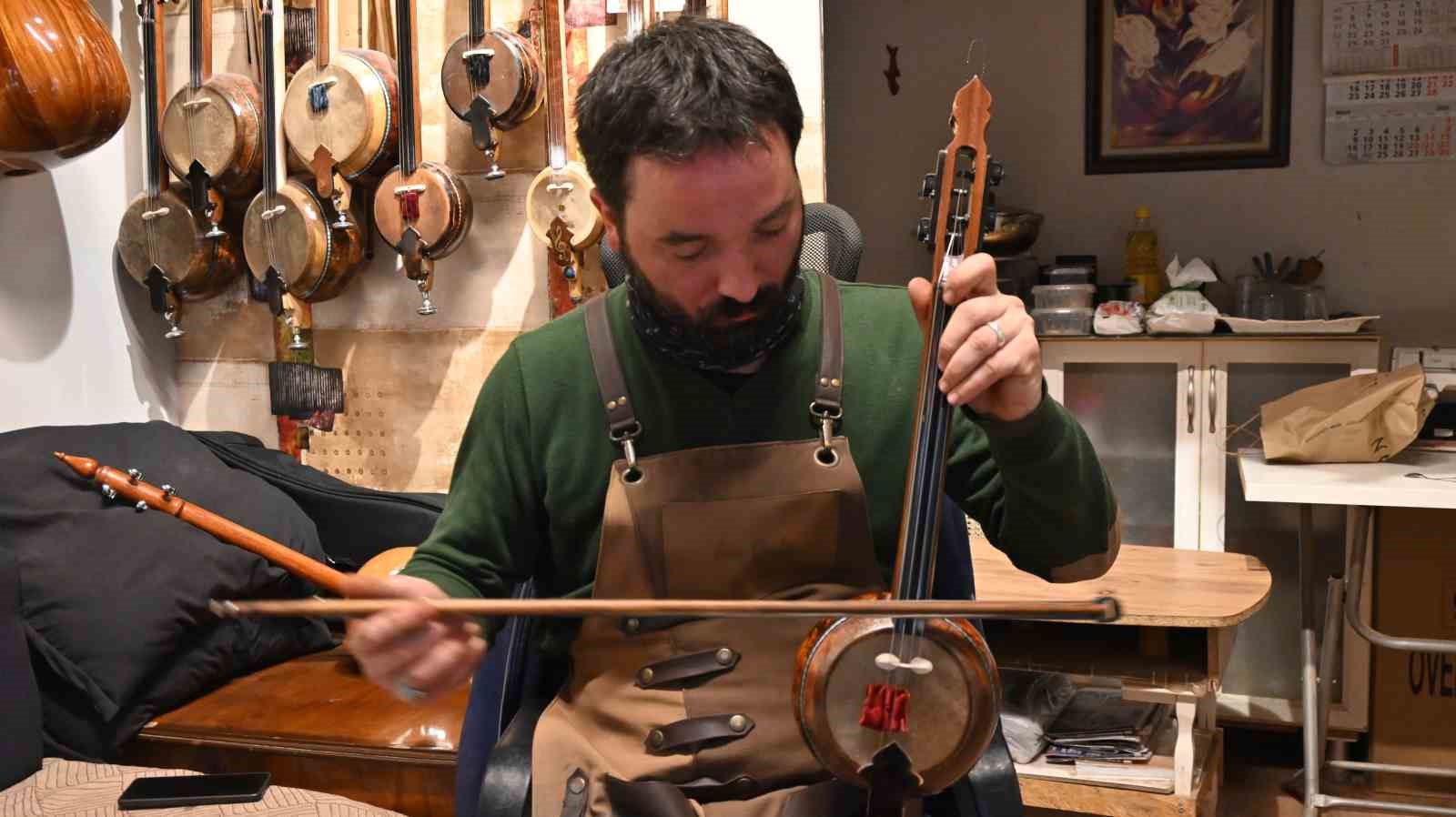 “Kabak kemaneyi zaten büyük bir heyecanla yapıyoruz. Çünkü 5 tane saz çıkartıyoruz mesela; 5’i de birbirine benzemiyor. Bunun sebebi de doğal malzemeden yapılıyor olması. Yürek zarı kullanıyoruz, bir hayvanın yürek zarı. Ondan dolayı her yaptığım sazın farklı tınıları, farklı özellikleri ve farklı karakterleri oluyor.”