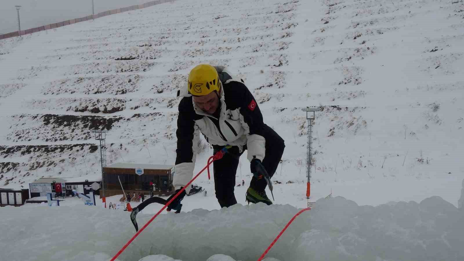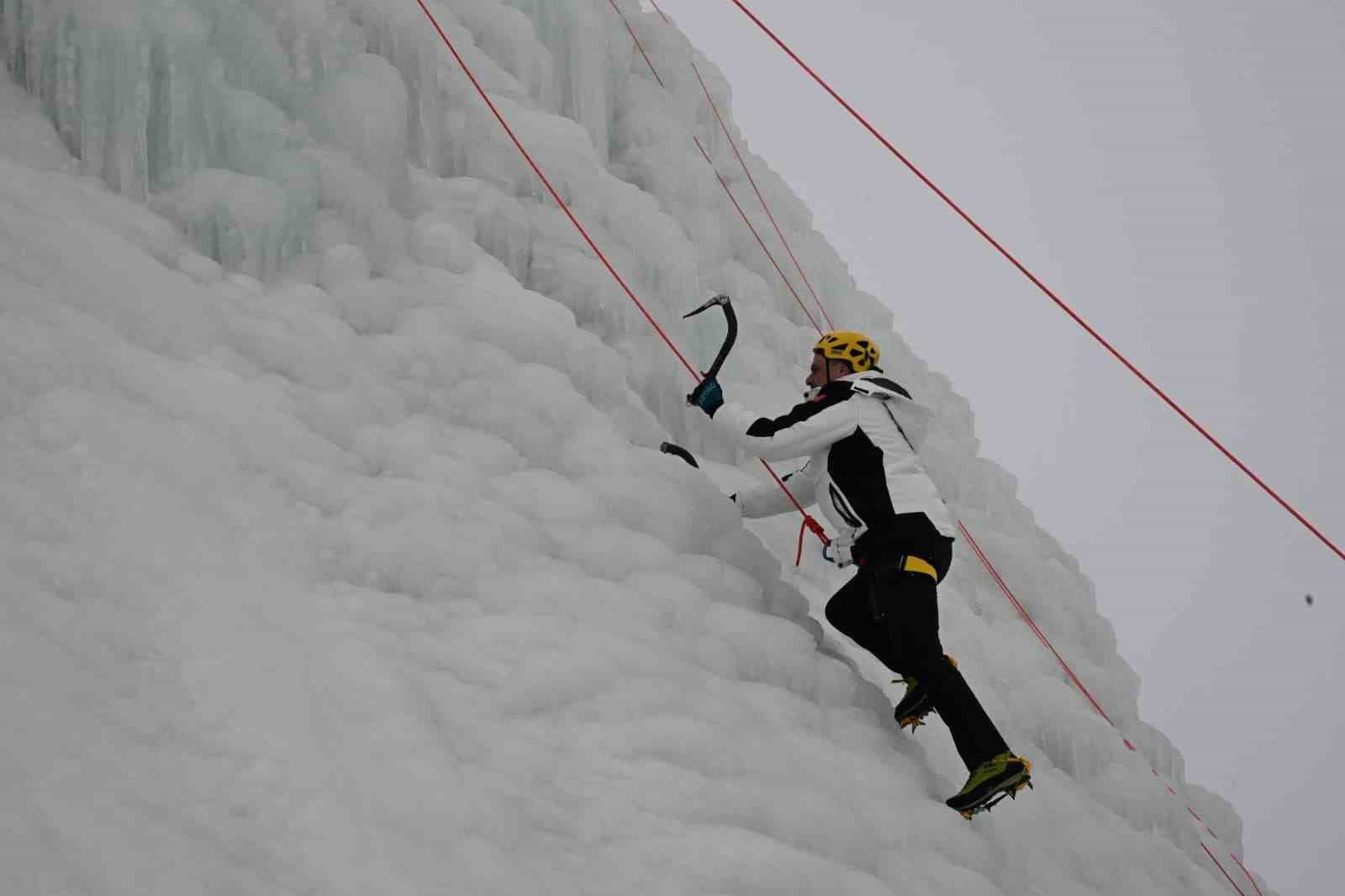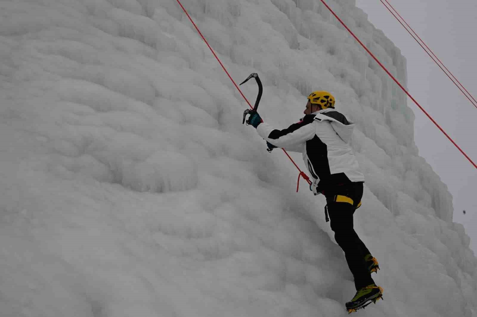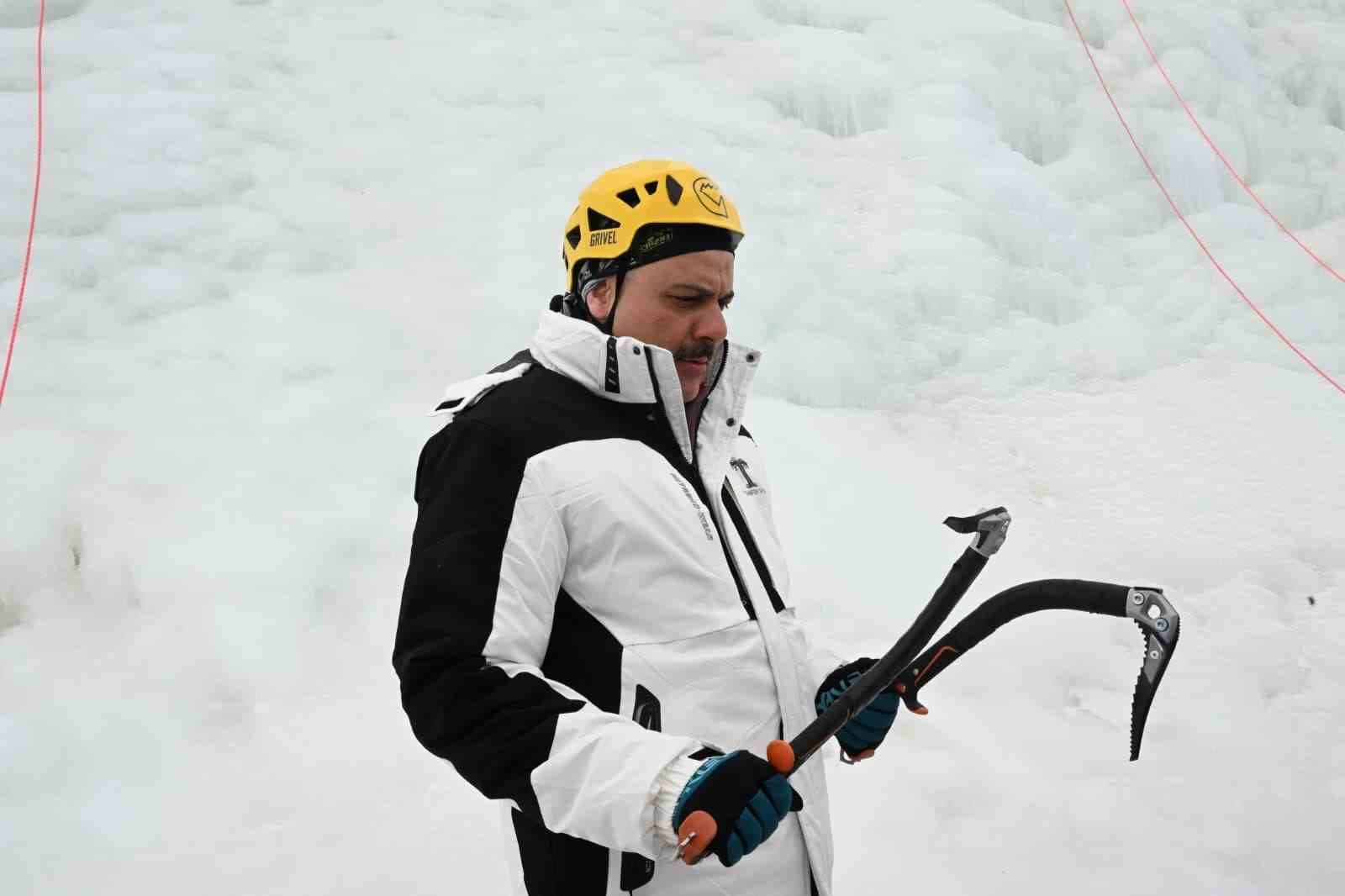 Erzurum Valisi Mustafa Çiftçi, Palandöken Kayak Merkezi’nde yapılan yapay buz duvarına tırmandı.
