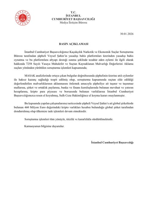 Başsavcılığın Medya İletişim Bürosu tarafından 30 Ocak 2026 tarihinde yapılan açıklamaya göre; şüpheli Veysel Şahin hakkında yürütülen soruşturmada, MASAK analizleri doğrultusunda haksız kazanç sağlandığı tespit edildi. Bu kapsamda Şahin’e ait taşınır ve taşınmaz mallar, şirket ve ortaklık payları, banka ve finans kuruluşlarındaki hesaplar ile kripto para piyasası ve borsalarındaki varlıklara el konuldu.